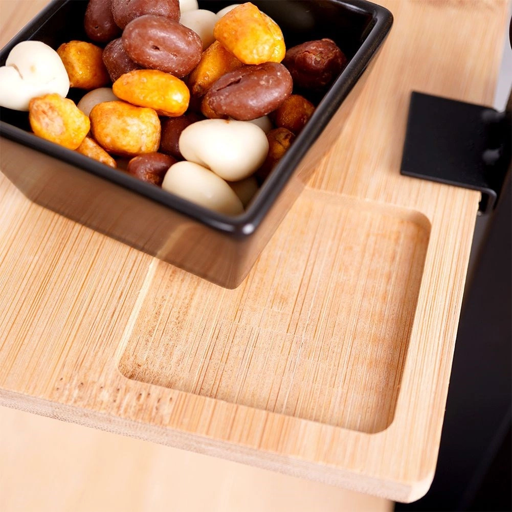 Ta moderna trietažna etažera združuje naravni bambus s črno kovino za stilsko predstavitev sladkih in slanih dobrot. Kompaktne mere 32 × 32 × 26,5 cm prihranijo prostor na mizi, medtem ko trije kvadratni pladnji (vsak 14,5 × 14,5 cm) omogočajo pregledno in privlačno razporeditev prigrizkov. Priložena je tudi keramična skledica (40 ml; 6,5 × 6,5 × 3 cm) za dipe, omake ali oreščke.