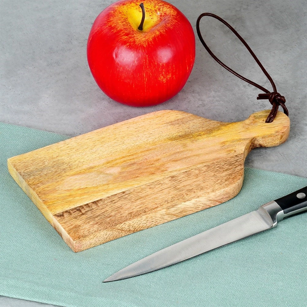 Elegantna in vsestranska deska z merami 19,5 × 10 × 1,5 cm se poda v vsako kuhinjo in na pogrnjeno mizo. Naravni mangov les deski zagotavlja visoko trdnost, dolgo življenjsko dobo in izjemno barvno strukturo. Zaradi kompaktne velikosti je primerna tako za pripravo manjših sestavin kot za stilsko serviranje.