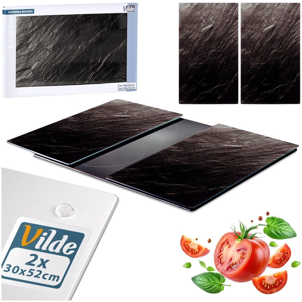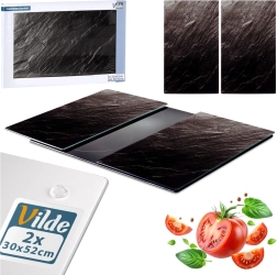 Ta dvodelni komplet steklenih desk združuje slog in funkcionalnost. Vsaka deska meri 52 × 30 × 0,4 cm in skupaj ustvarita velikodušno površino 60 × 52 cm, ki jo lahko uporabite za rezanje, serviranje ali kot pokrov kuhalne plošče. Kaljeno steklo s črnim kamnitim videzom doda kuhinji moderen pridih in hkrati ščiti površine pred poškodbami.