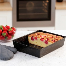 Pravokotni pekač velikosti 27,5 × 22,5 × 6 cm je odlična izbira za vsakodnevno peko in praznične menije. Ogljikovo jeklo odlično prevaja toploto, kar zagotavlja enakomerno zapečenost in zanesljive rezultate pri sladkih in slanih jedeh.