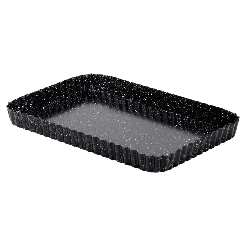 Pravokoten pekač z valovitim robom in odstranljivim dnom je odlična izbira za domače in praznično peko. Zahvaljujoč kakovostnemu ogljikovemu jeklu z granitnim premazom odlično prevaja toploto in pomaga doseči popolne in enakomerno pečene rezultate brez prismoditev.