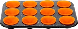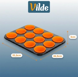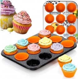 Ta granitni pekač za 12 mafinov je izdelan iz kakovostnega ogljikovega jekla z nelepljivim premazom, ki zagotavlja enakomerno peko in enostavno odstranjevanje brez prijemanja. V paketu je 12 večkratnih silikonskih košaric v oranžni barvi – odlična okolju prijazna zamenjava za enkratne papirnate košarice.