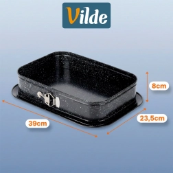 Dimenzije: notranje 35 × 24 × 6,5 cm; zunanje 39 × 27,5 × 8,5 cm. Kakovostna izdelava za dolgo življenjsko dobo in udobno peko doma ali ob slavnostnih priložnostih.