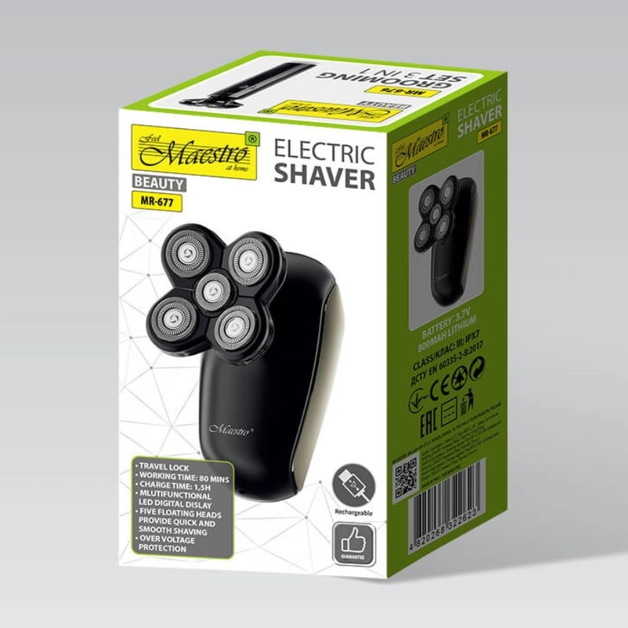 Maestro MR-677 je zanesljiv brivnik za glavo, zasnovan za hitro in udobno gladko britje. Zahvaljujoč 5 gibljivim brivnim glavicam in fleksibilni glavi natančno sledi linijam glave in vratu, zmanjšuje draženje in skrajša čas britja. Vodoodporna zasnova IPX7 omogoča suho ali mokro britje pod prho.