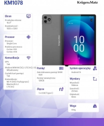 Moderen tablični računalnik KRÜGER&MATZ Eagle 1078S ponuja 11" IPS zaslon z ločljivostjo 1920 × 1200, 90Hz gladkost, zmogljiv 8-jedrni procesor MediaTek in 8 GB RAM za hitro delo in zabavo. S 256 GB shrambe (razširljive z microSD), LTE, Wi‑Fi ac, Bluetooth 5.2 in baterijo 7000 mAh je pripravljen za celodnevno uporabo, video klice in multimedijo.