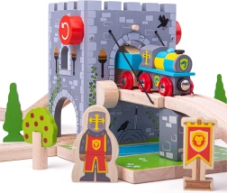 Ustvarite na progi srednjeveško utrdbo! Leseni dvižni most BIGJIGS RAIL z delujočo vitlo omogoča otrokom dvigniti most, ustaviti vlakec in uprizoriti viteške pustolovščine. Realistično kamnito zidovje, grbi, bakle in most čez “vodni” jarek spodbujajo domišljijo in tematsko igro.