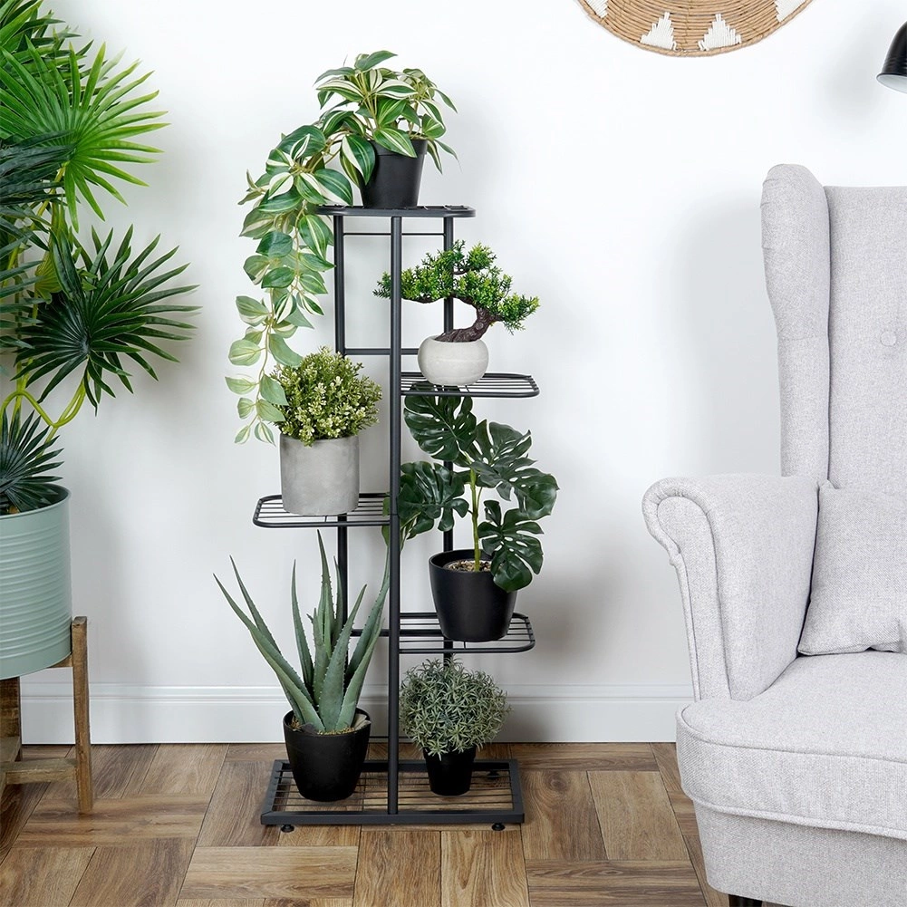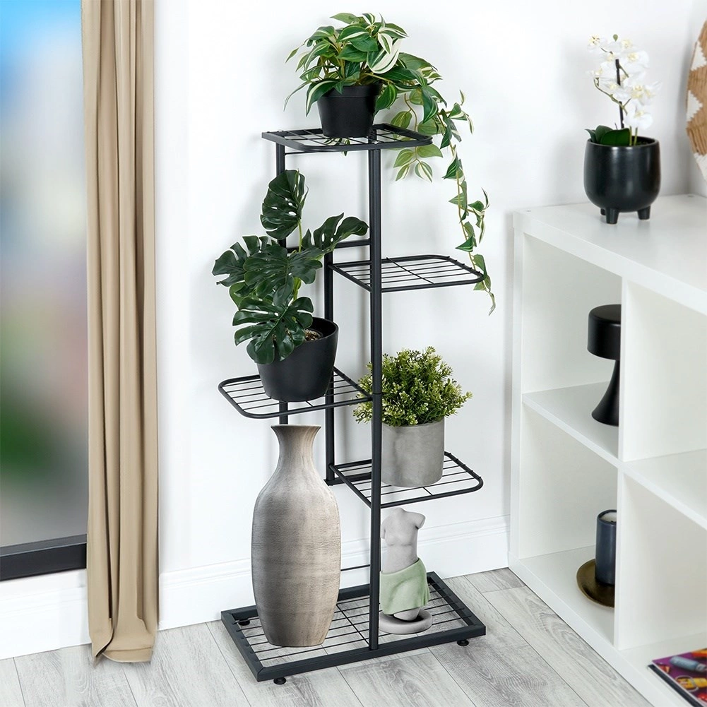 Pet nivojev polic omogoča bogato zeleno kompozicijo brez zasedanja tal. Idealno ob oknu, v kotu dnevne sobe ali na pokritem balkonu.