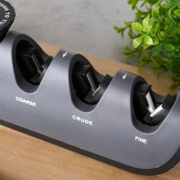 Stopnje Coarse, Crude in Fine (keramika) obnovijo in spolirajo rezilo; ločen diamantni utor natančno nabrusi škarje.