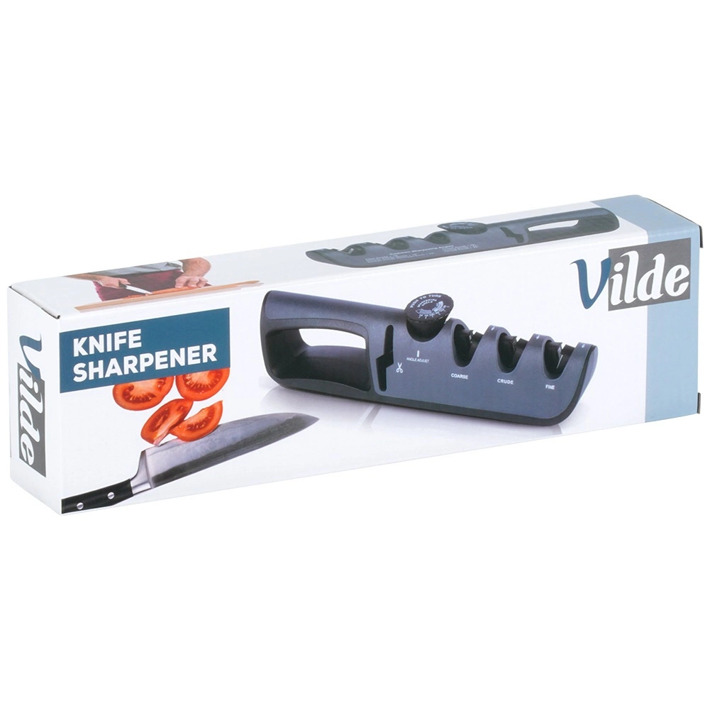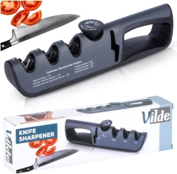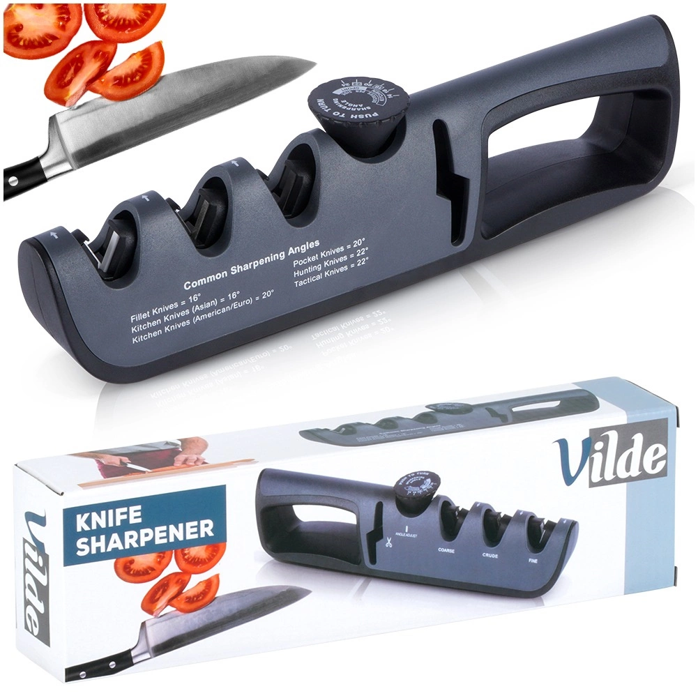 Ta univerzalni brusilnik nožev Vilde združuje udobje domačega brušenja s preciznostjo nastavljivih kotov. Z vrtilnim izbirnikom preprosto nastavite pravilen kot 14–24° glede na tip rezila – od kuhinjskih in file nožev do EDC in lovskih nožev. Zahvaljujoč nedrseči osnovi in ergonomskemu ročaju s širokim oprijemom je delo varno in stabilno.