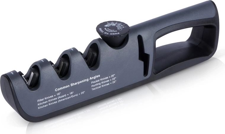 Vrtljiv kolešček omogoča nastavitev idealnega kota za kuhinjske nože (14–20°), EDC in zložljive nože (20–22°) ali robustnejša zunanja in lovska rezila (22–24°).