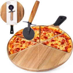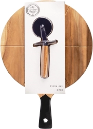 Praktičen set za ljubitelje pic: lesena plošča iz akacijevega lesa z vodilnimi utori za 6 enakih kosov in kovinski rezalnik za pico z lesnim ročajem. Dvostranska uporaba, stilsko serviranje, udobno prenašanje zahvaljujoč dolgemu ročaju ter odpornost na vlago in temperature do 70 °C.