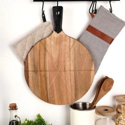 Dolg ročaj z odprtino omogoča varno prenašanje in udobno obešanje na kuhinjsko ograjo. Akacijev les je odporen proti vlagi in hkrati lahek, zato je z ploščo enostavno rokovati. Za dolgo življenjsko dobo priporočamo ročno pomivanje in redno nego z oljem za les.