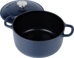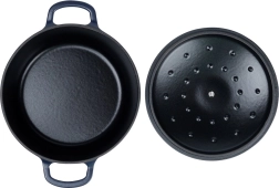 - Dizajn: zunanjost temno modra, notranjost črn emajl – praktičen in eleganten dodatek za kuhanje.