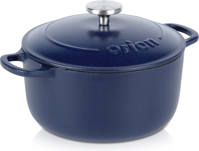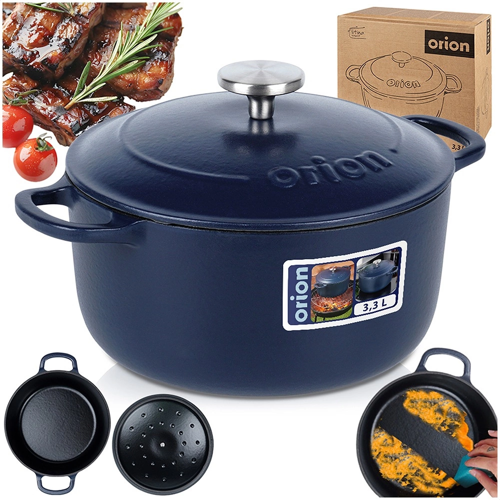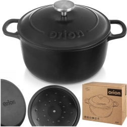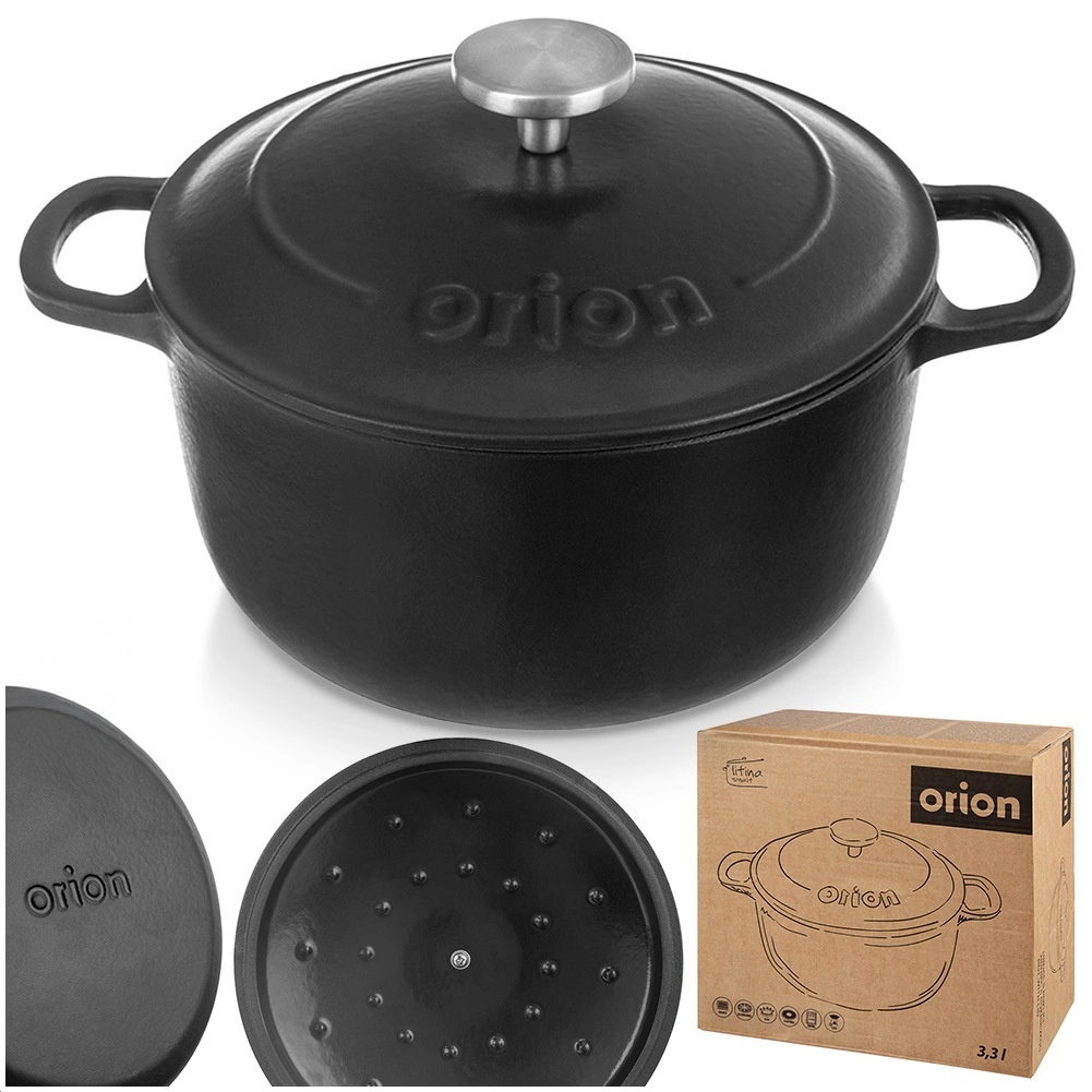 Univerzalen litoželezni lonec s pokrovom in prostornino 3,3 l za vsakodnevno kuhanje in počasno dušenje. Zaradi enakomerne porazdelitve toplote, dolge akumulacije in odpornosti do 250 °C je idealen za juhe, golaže in pečeno meso. Notranja emajlirana površina olajša kuhanje, serviranje in čiščenje, robustni stranski ročaji ter nerjaveč ročaj na pokrovu pa zagotavljajo varno rokovanje. Preverjena kakovost znamke ORION.