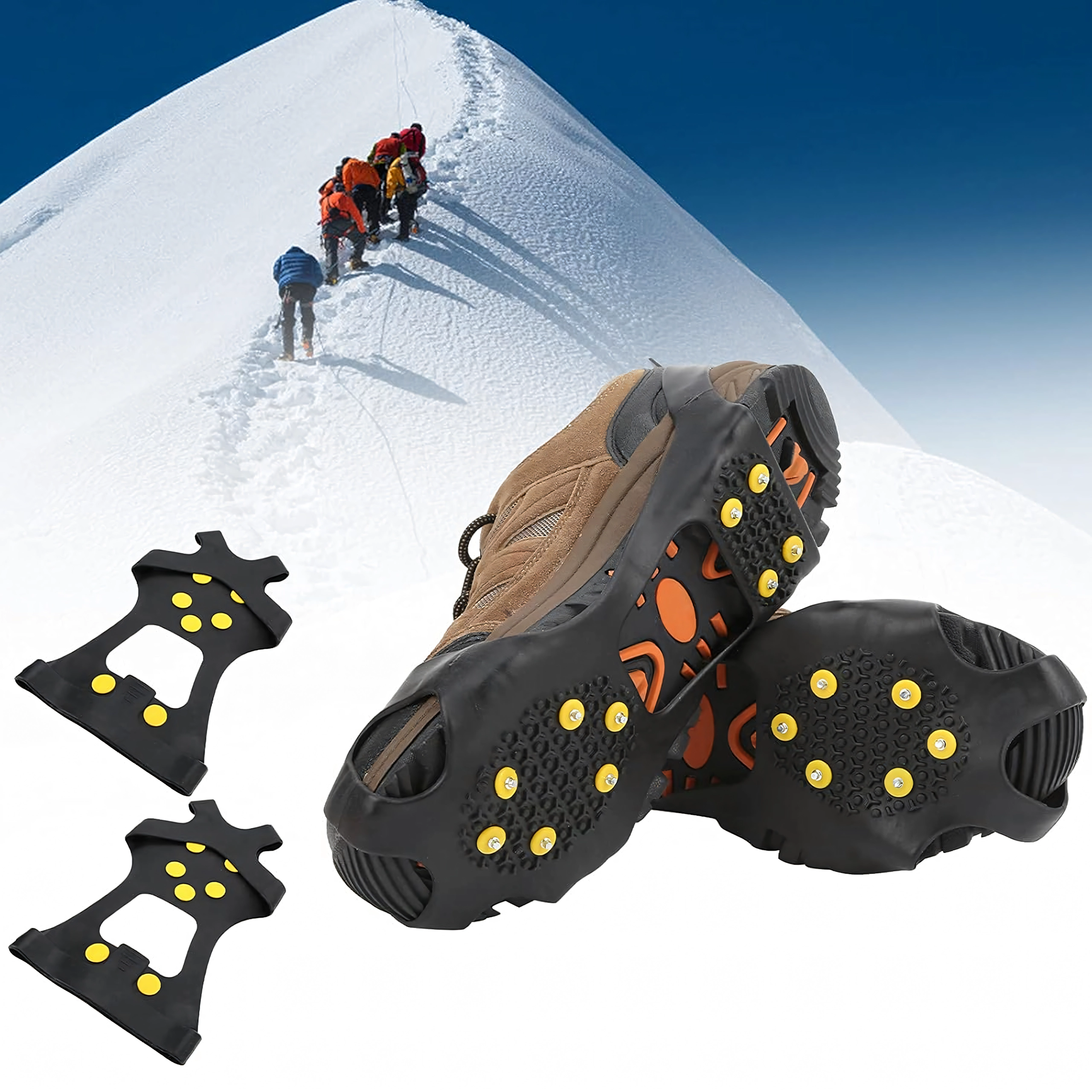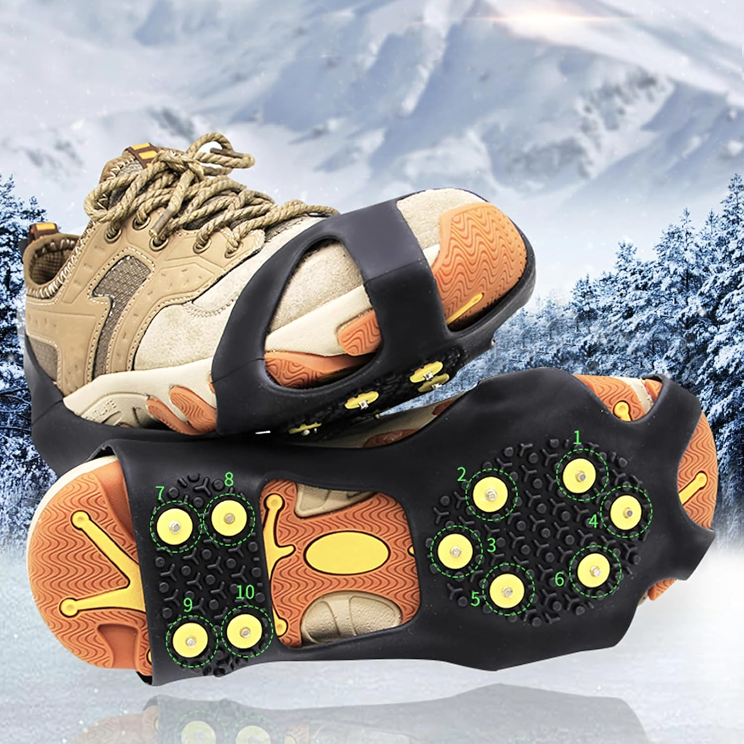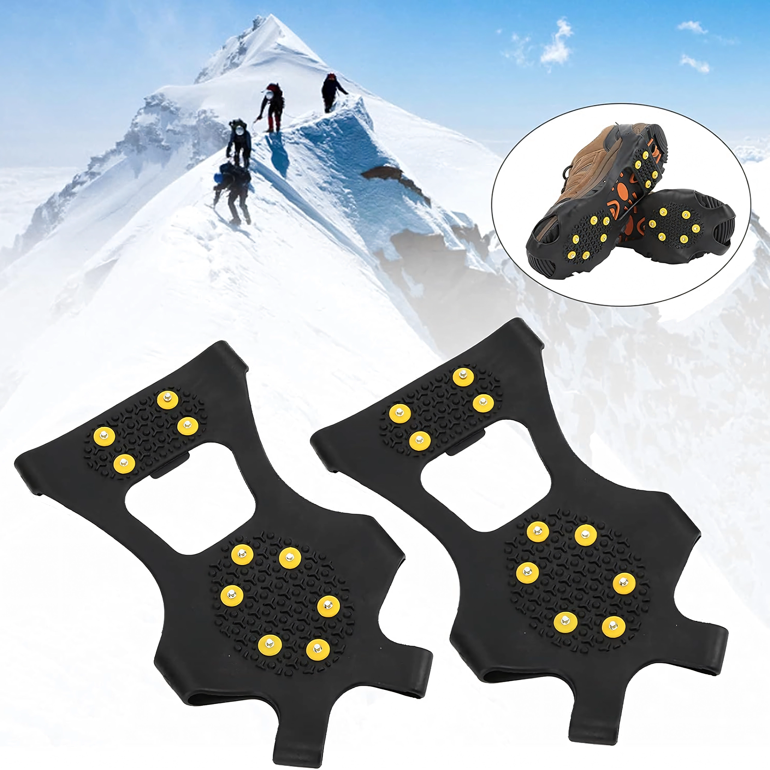 Zanesljivi neslipni nastavki za čevlje s kovinskimi konicami za varen korak na snegu, ledu in blatu. Izdelani iz odporne TPE gume in kovine, ponujajo odličen oprijem, stabilnost in enostavno namestitev. 10 kovinskih konic zagotavlja zanesljiv korak na vsakem terenu, nastavki so lahki, elastični in kompaktni – idealni za pohodništvo, delo na terenu in vsakodnevno zimsko hojo.