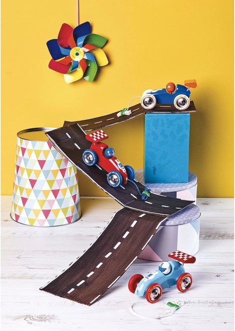 Ta modro-oranžni vlečni dirkalni avto navduši s čistim dizajnom in trpežno izdelavo. Zahvaljujoč kovinskim gumiranim kolesom je vožnja tiha in gladka, zato lahko otroci avto varno in udobno vzamejo s seboj kamor koli. Kakovosten lakiran les zagotavlja dolgo življenjsko dobo in enostavno vzdrževanje.