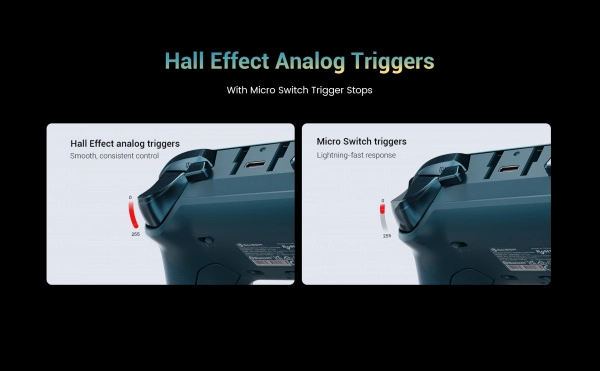 - TMR analogne palice, Hall Effect sprožilci z mikrostikalnimi končnimi hodi, optični ABXY, mehanski D‑pad