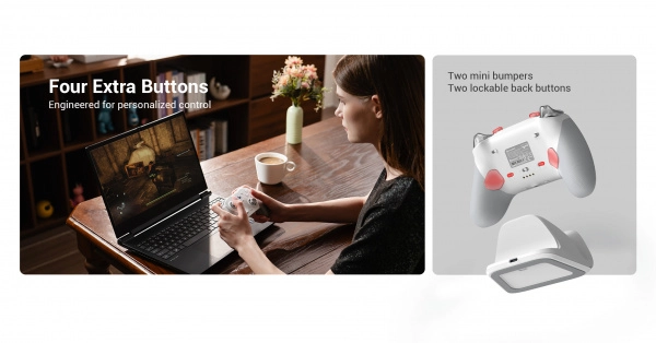 Za zahtevne igralce ponuja optična mikro-stikala ABXY, natančen mehanski D‑pad, dva mini bumperja R5/L5, dva zadnja programabilna gumba R4/L4 in način kratkega hoda sprožilcev za hitre FPS akcije. Izboljšana haptična povratna informacija s štirimi motorčki prinaša intenziven odziv v ročajih in sprožilcih. Del paketa je tudi praktična polnilna postaja za udobno polnjenje in shranjevanje.