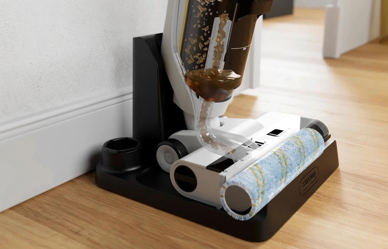 FCV 3 združuje moč sesanja, temeljito pomivanje in hitro sušenje v enem koraku, zato skrajša čas čiščenja do 50 %. Integrirano sesanje obvlada prah, drobtine in živalsko dlako, medtem ko rotacijski valjčki tla operejo in jih nato pustijo skoraj suha. Zaradi lahke zasnove in okretne glave boste udobno čistili tudi ob robovih in v kotih.