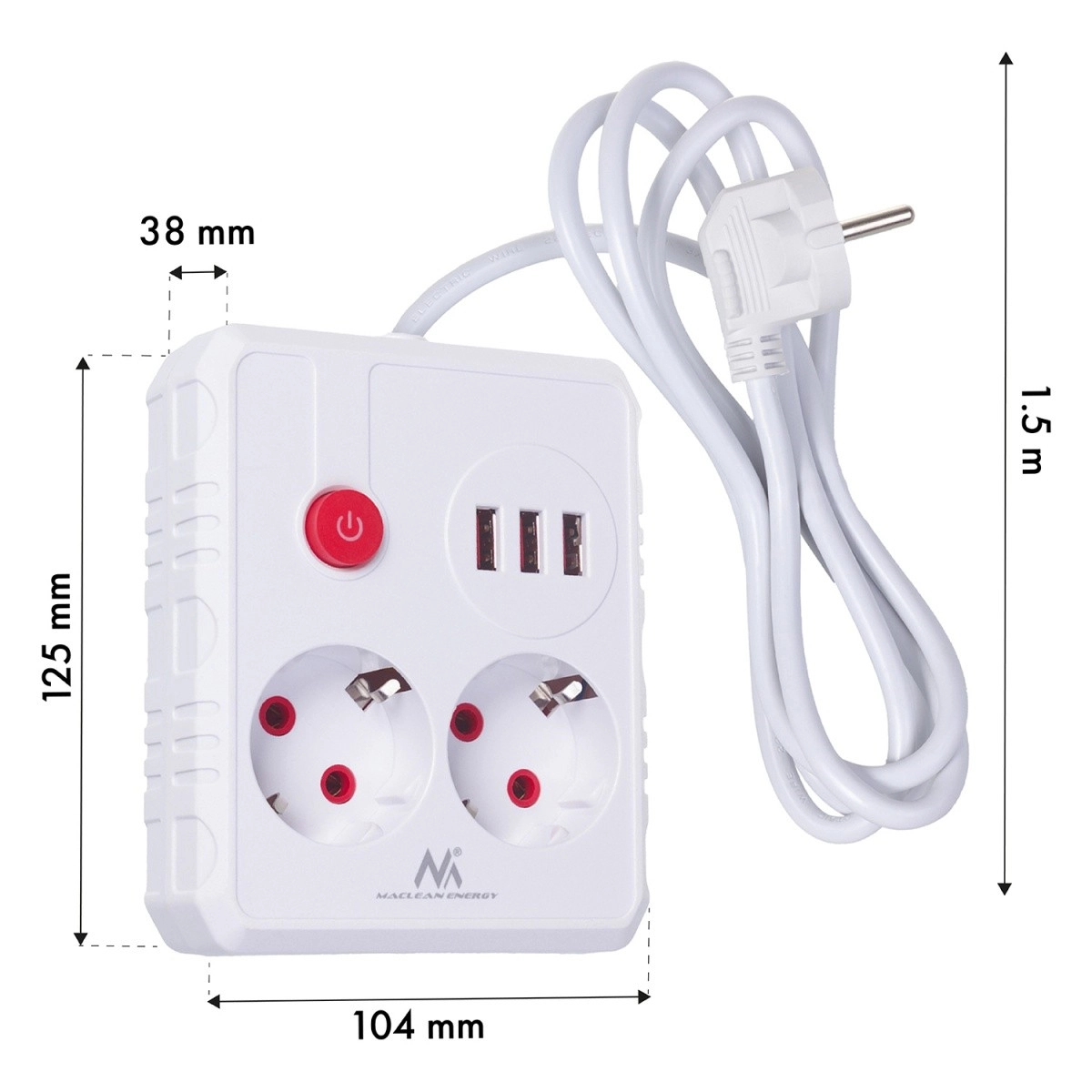 Ta moderna napajalna letva združuje dve Schuko vtičnici s tremi USB vrati za hitro in udobno polnjenje telefona, tablice ali manjše elektronike. Z močjo 2500 W zanesljivo napaja običajne domače in pisarniške naprave, medtem ko kompaktna oblika in čisto bel dizajn pristajata vsakemu interierju.