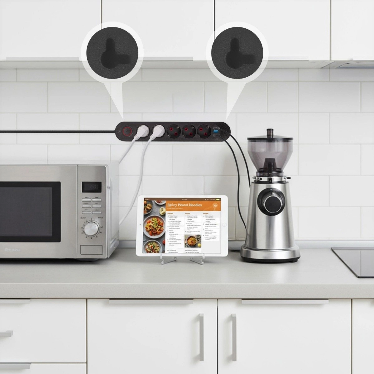 Pet vtičnic Schuko in trije USB priključki omogočajo napajanje naprav ter hkrati polnjenje telefonov, tablic ali slušalk – brez potrebe po ločenih adapterjih.