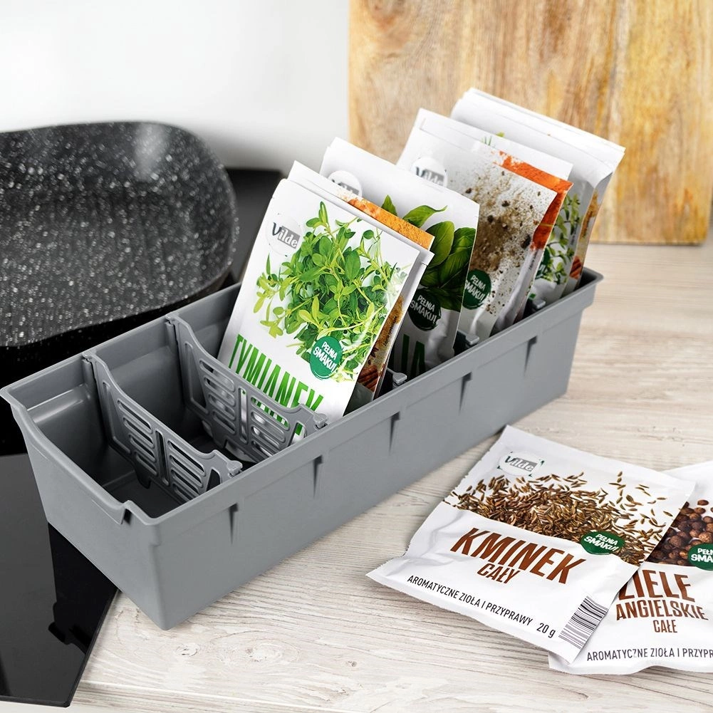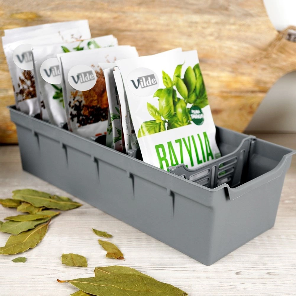 Praktičen siv organizator s pregradami za pregledno shranjevanje vrečk z začimbami. Vse ohranja na svojem mestu, prihrani prostor v predalu in omogoča hitro iskanje prave začimbe. Izdelan iz odporne plastike, je lahek, stabilen in zahvaljujoč odstranljivim pregradam lahko preprosto prilagodite velikost predalčkov.