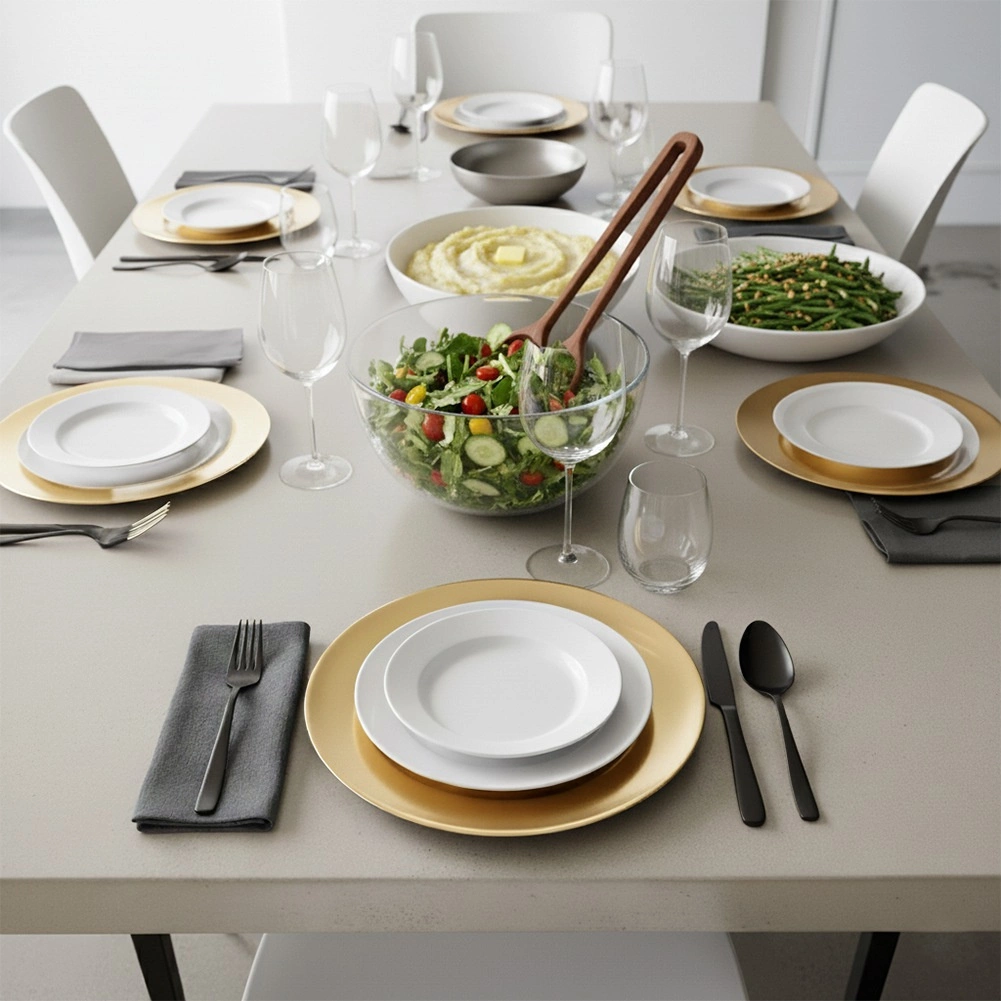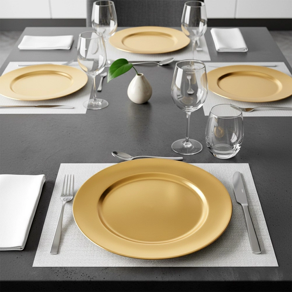 Ta okrogli zlati podkrožnik je stilska osnova za vsak pogrinjek. Širok rob in izrazit kovinski sijaj takoj povzdigneta videz krožnikov, kozarcev in pribora, hkrati pa ščitita površino mize pred toploto in madeži. Idealen za vsakodnevno uporabo in svečane priložnosti.
