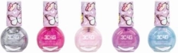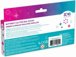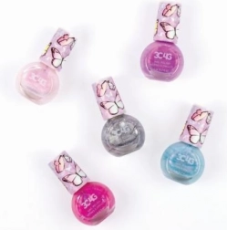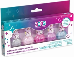 Set vsebuje 5 lakov za nohte s prostornino 5 ml, od tega 3 laki vsebujejo bleščice v obliki metuljčkov.