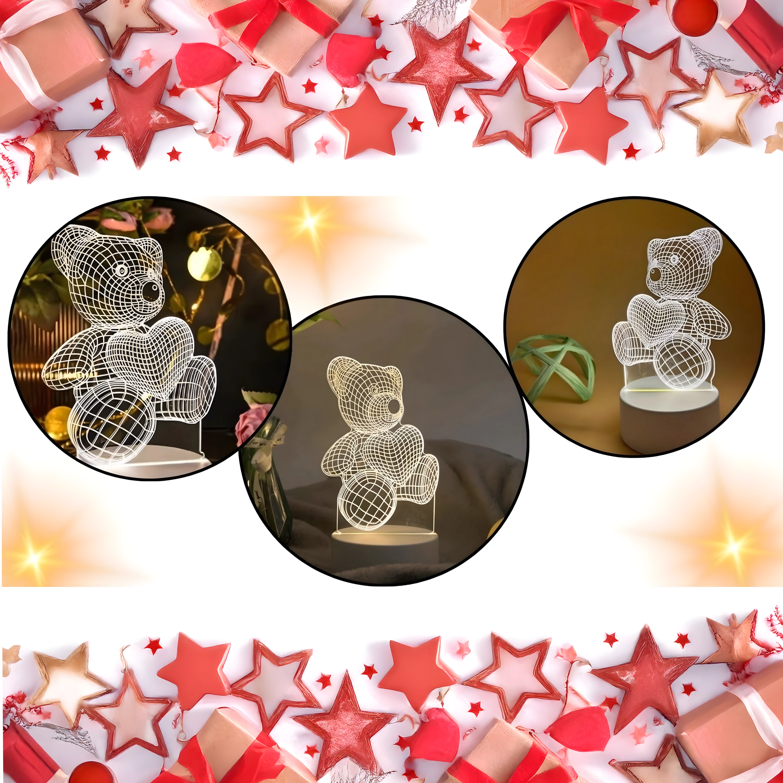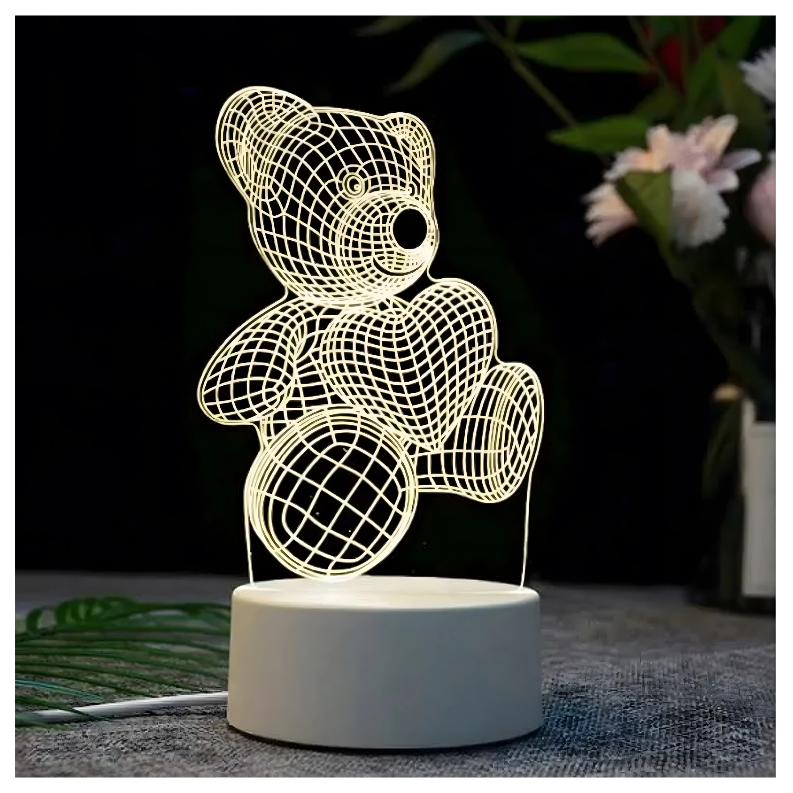 Ta dekorativna nočna svetilka v obliki medvedka, ki drži srce, uporablja prozoren akril z gravirano mrežico, ki ob prižigu ustvari realističen 3D učinek. Zaradi mehke, pomirjujoče svetlobe je idealna za uspavanje otrok, večerno branje ali nežno osvetlitev polic in mizic.