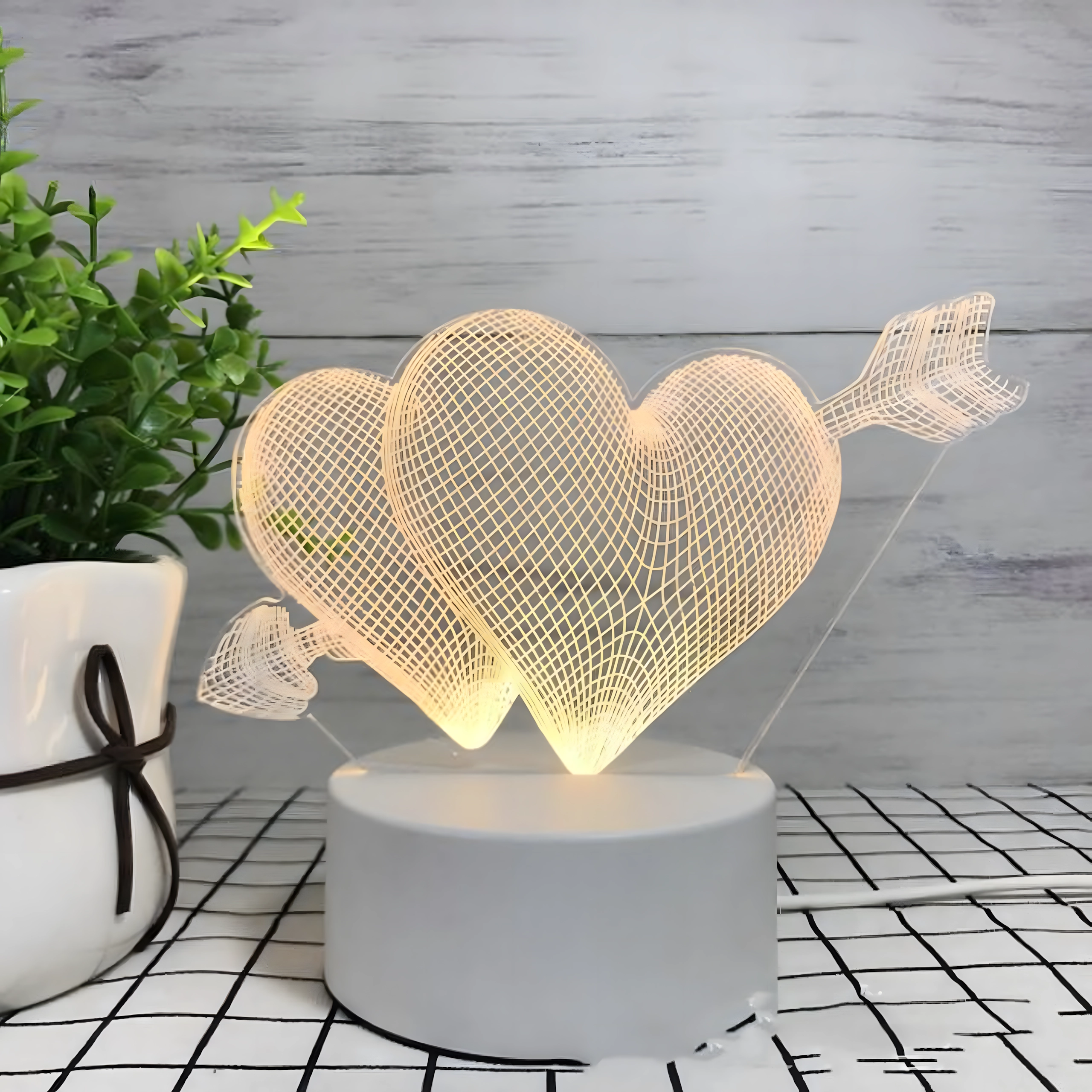 Poživite interier s čarobno igro svetlobe. Lučka z dvema prepletenima srci in puščico zariše nežno 3D optično iluzijo, ki izstopa v spalnici, otroški sobi ali dnevni sobi. Zaradi kompaktnega podstavka in prijetnega toplega odtenka je idealna za večerni počitek ali kot pomirjujoča nočna svetilka.