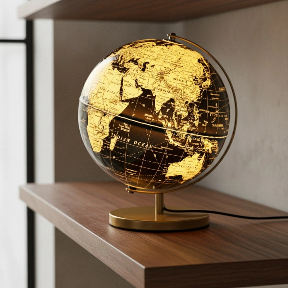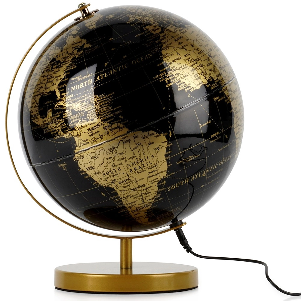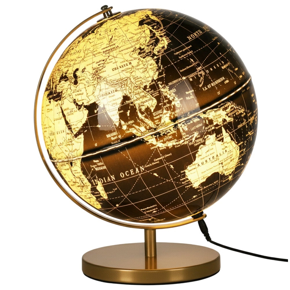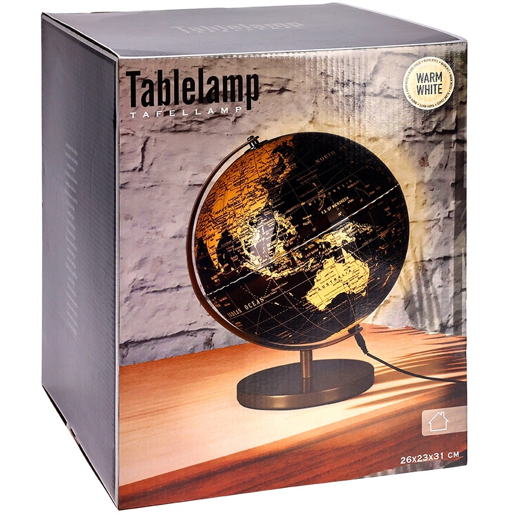 Ta dekorativna namizna svetilka v obliki globusa je praktičen in estetski dodatek za dnevno sobo, spalnico ali delovni prostor. Črno-zlata izvedba z dovršeno obdelavo deluje moderno, topla LED svetloba pa ustvari prijetno atmosfero brez bleščanja.