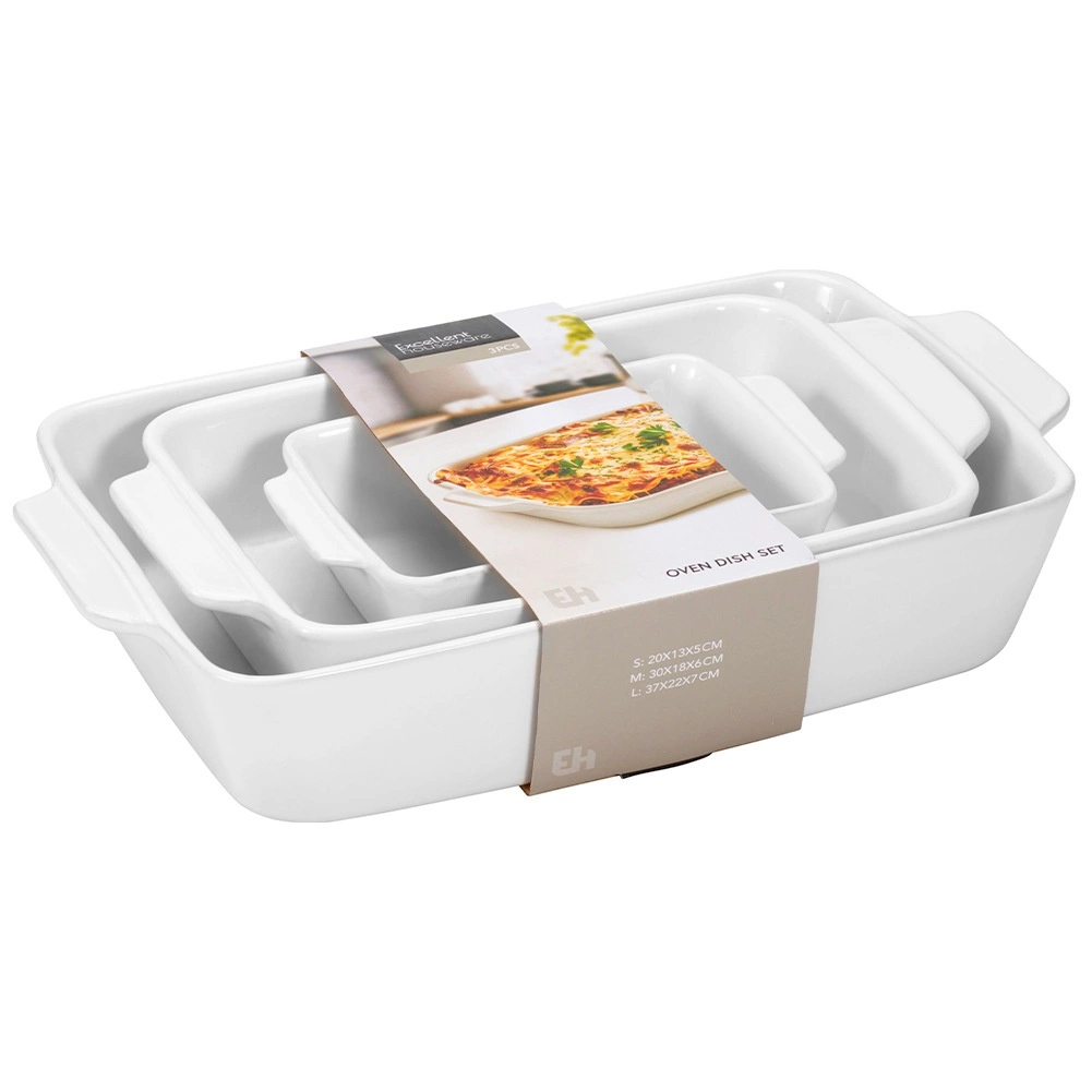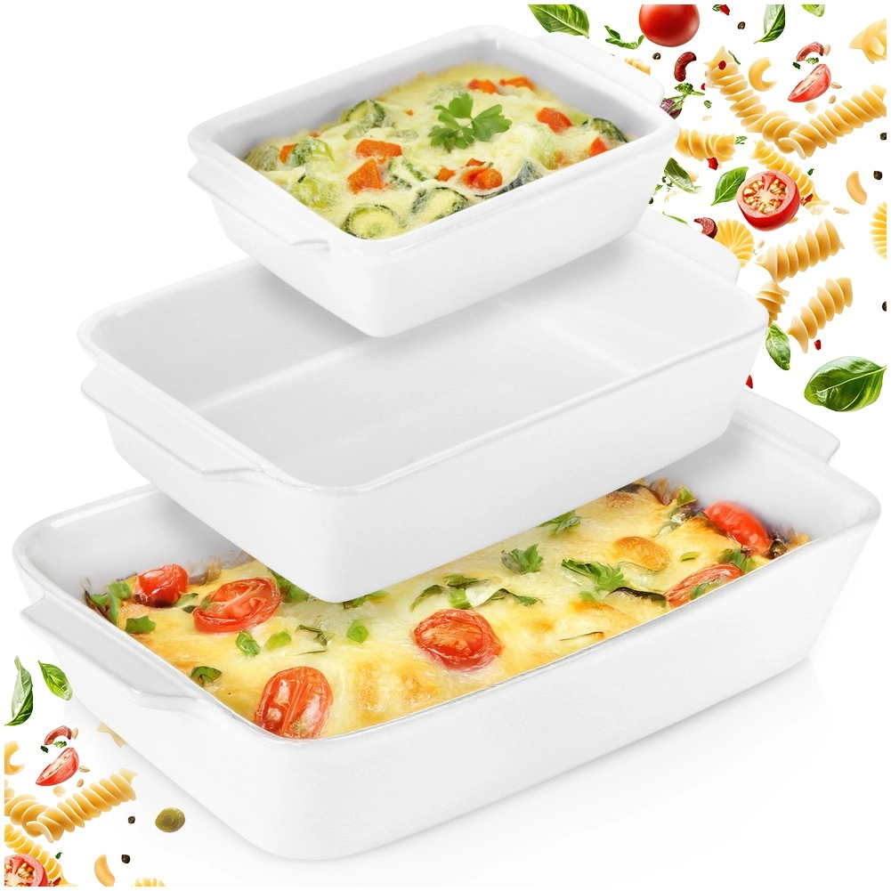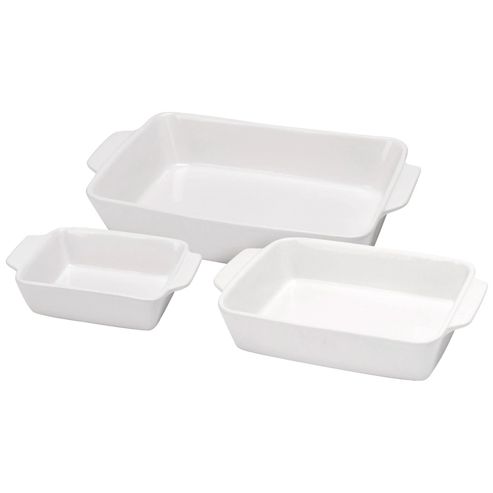 Ta eleganten set treh pravokotnih pekačev iz kakovostne kamnine je idealen za lazanje, zapečen krompir, zelenjavne in mesne jedi, pa tudi za pite in sladice. Gladka glazura se enostavno čisti, zahvaljujoč čisto belemu dizajnu pa lahko jedi postrežete neposredno iz pečice na mizo.