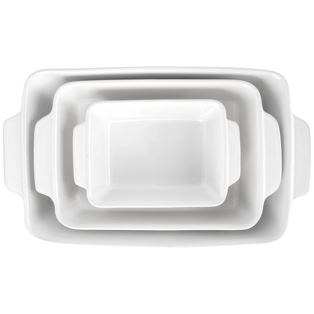 Praktičen set treh keramičnih pekačev v beli barvi za vsakodnevno peko in serviranje. Različne velikosti (3 l, 1,5 l, 0,5 l) pokrijejo vse od zapečenih jedi preko sladic do prilog. Vzdržljiva kamnina enakomerno porazdeli toploto in jo dolgo zadržuje, vgrajeni stranski ročaji olajšajo prenašanje, posode pa lahko zložite eno v drugo za prihranek prostora. Primerno za pečico (do 220 °C), mikrovalovko in pomivalni stroj.