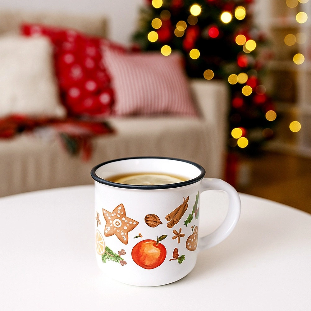 Vnesite v svoj dom praznično vzdušje z elegantno belo skodelico, okrašeno z motivi medenjakov, začimb, sadja in zimskih dekoracij. Črni rob na zgornjem robu poudari čist dizajn in skodelici doda poseben značaj. Idealna za vroče napitke v hladnih dneh.