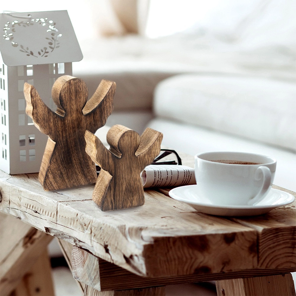 Ta elegantna figurica angela je izdelana iz kakovostnega mangovega lesa v naravnem odtenku. Minimalistična silhueta z razprtimi krili izgleda učinkujoče na polici, komodi in na praznično pogrnjeni mizi. Zaradi brezčasnega videza je primerna za zimsko in božično obdobje, hkrati pa krasi dom skozi vse leto.