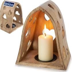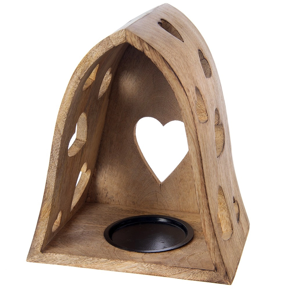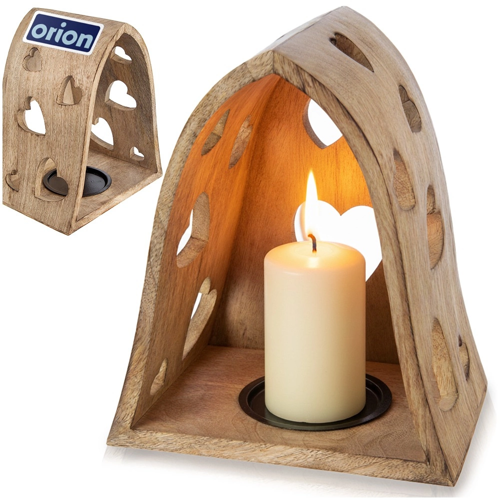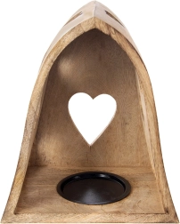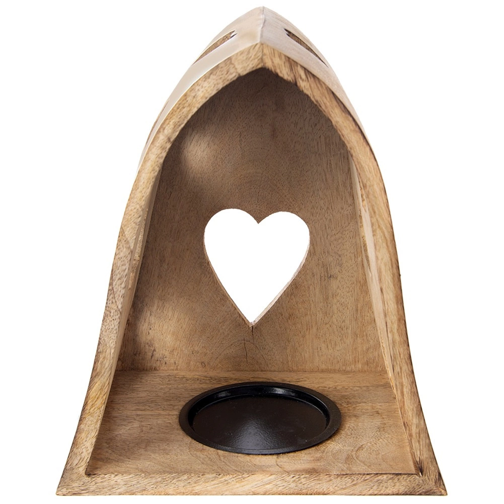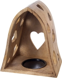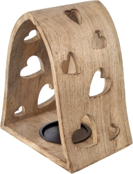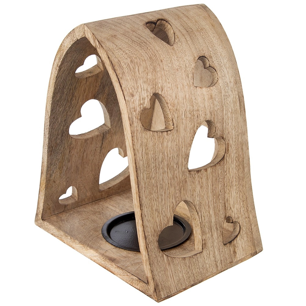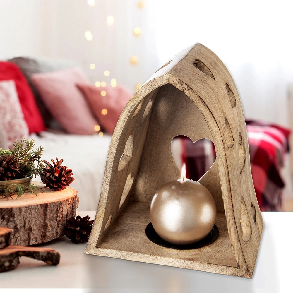 Elegantni lesen svečen iz mangovega lesa z izrezljanimi srčnimi motivi po prižigu ustvari romantično igro svetlobe. Zahvaljujoč kovinski posodici je primeren za čajne in stebrne sveče s premerom približno 7,5 cm. Vsak kos je ročno izdelan in edinstven po svoji naravni strukturi in odtenku.