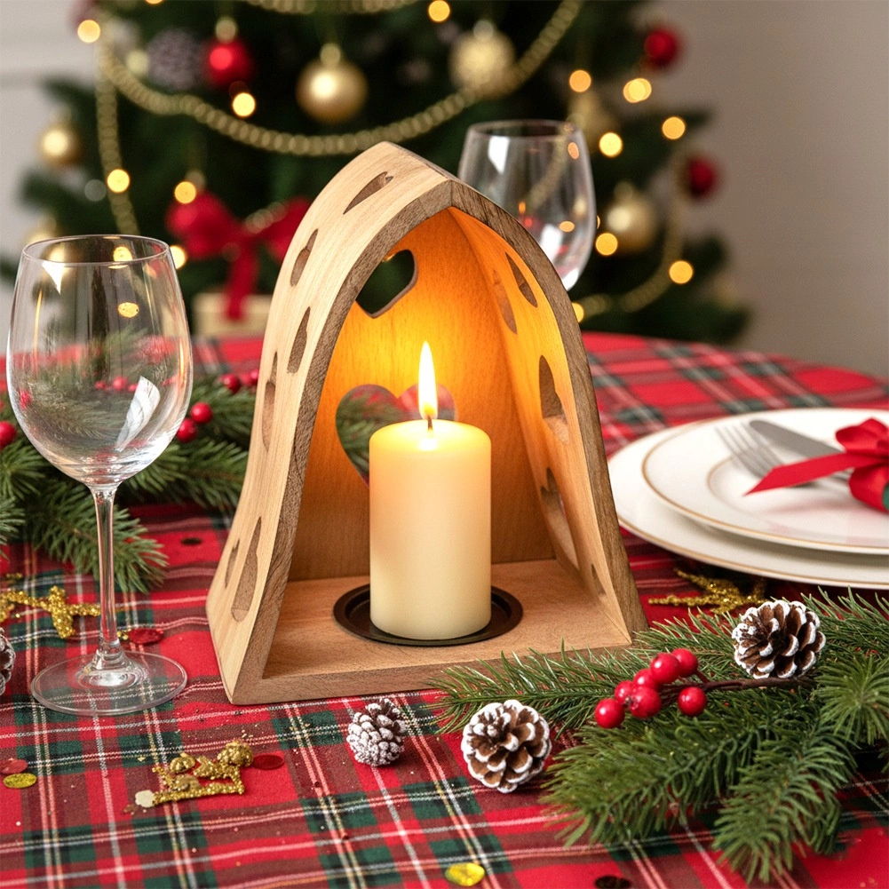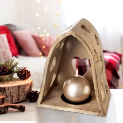 Ta dekorativni svečen v lokasti obliki združuje naraven videz mangovega lesa z nežnimi izrezi src, ki ob prižigu projicirajo toplo svetlobno igro v okolico. Idealen za dnevno sobo, spalnico, kopalnico ali pokrito teraso.