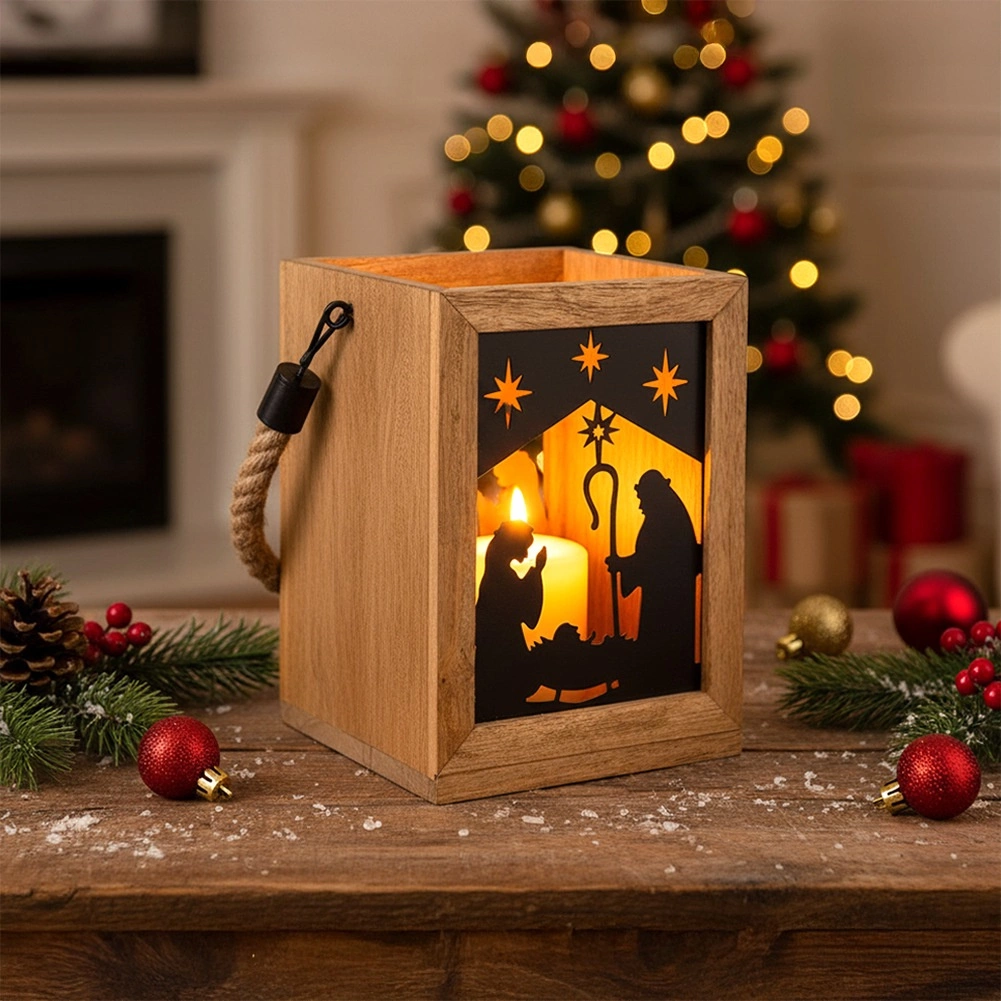 V dom vnesite čar božiča z leseno laterno iz mangovega lesa v dimenzijah 14 × 14 × 20 cm. Črni kovinski paneli z motivom Svete družine in zvezd prepuščajo toplo svetlobo ter ustvarjajo očarljive svetlobne projekcije. Laterna je namenjena postavitvi na komodo, mizo ali tla, lahko pa jo tudi obesite zahvaljujoč robustnemu pletenemu vrvnemu ročaju.