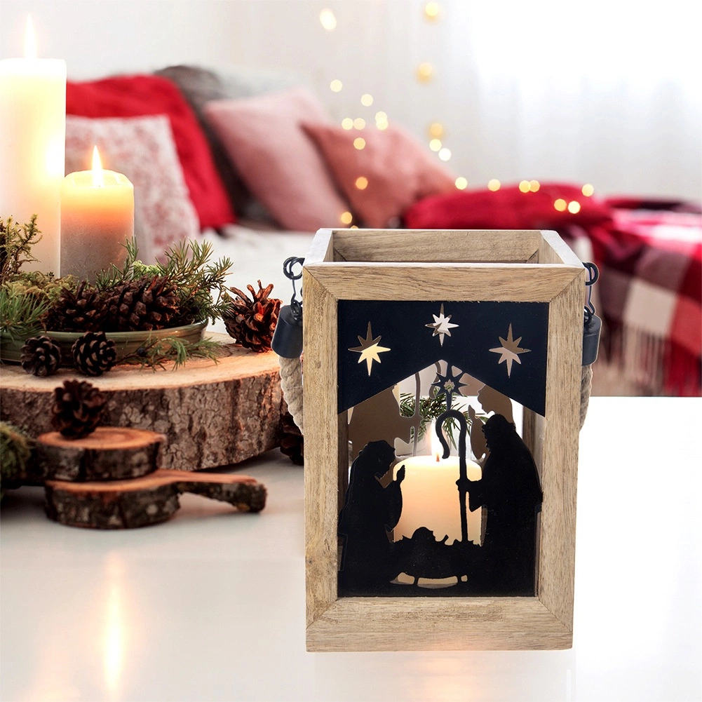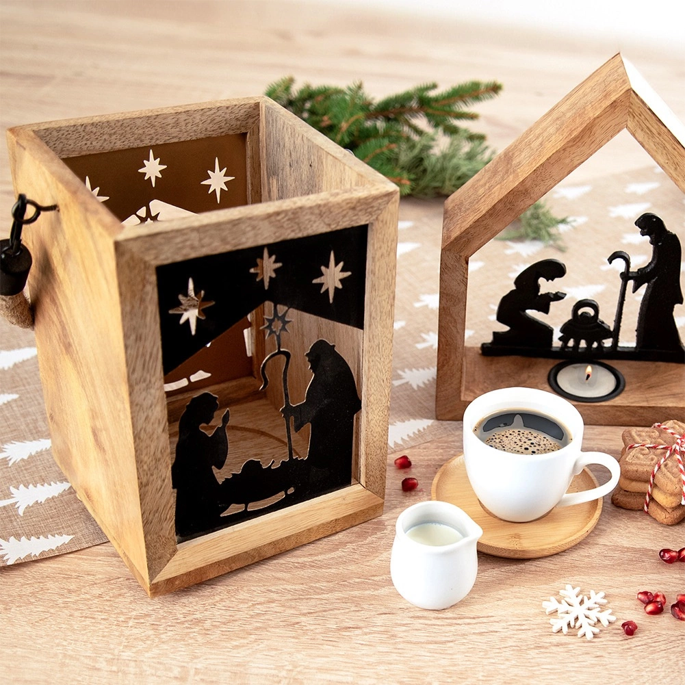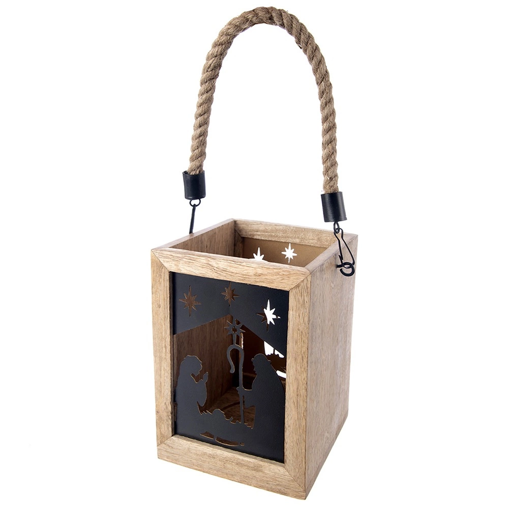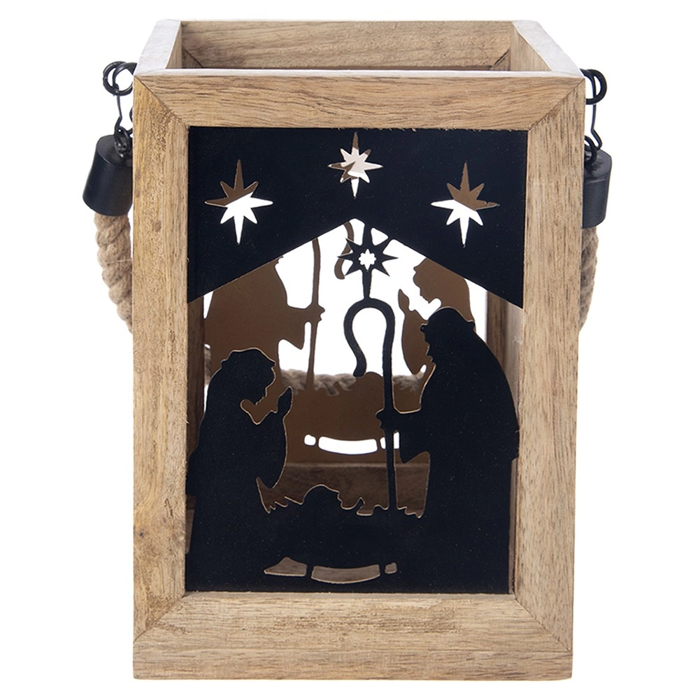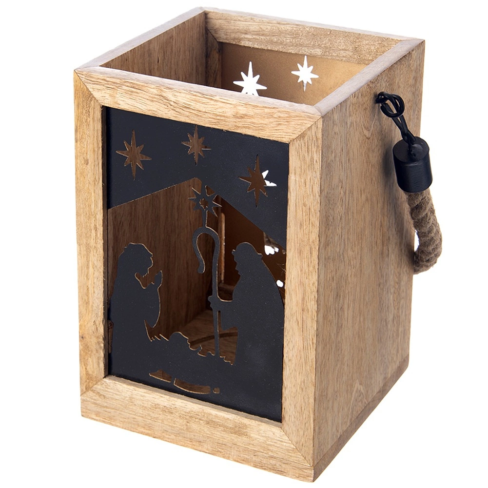 Stilska laterna iz eksotičnega mangovega lesa z motivom jaslic ustvarja toplo vzdušje in prijetno svetlobo. Zahvaljujoč močnemu vrvnemu ročaju jo je mogoče zlahka prenašati ali obesiti, primerna je za čajne in klasične sveče ter je odlična božična dekoracija za vsak interier.