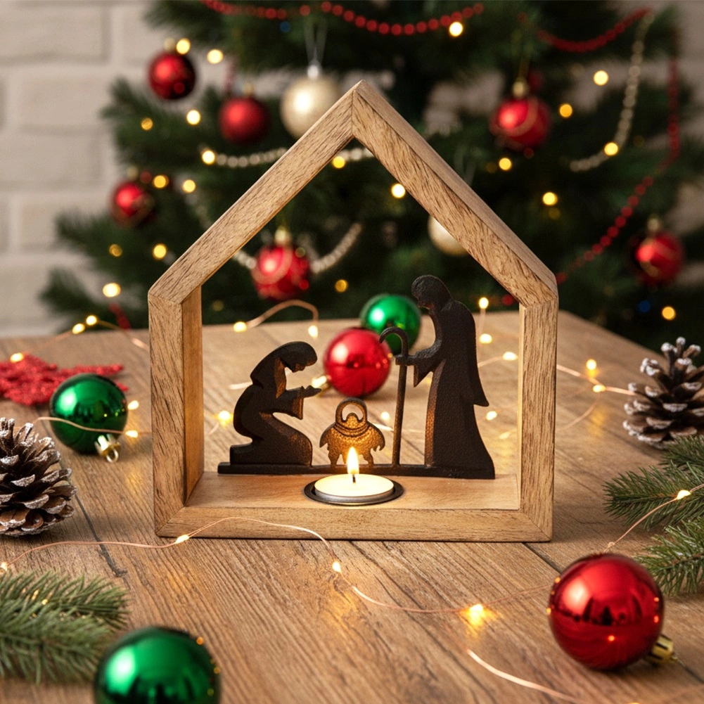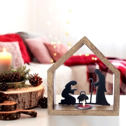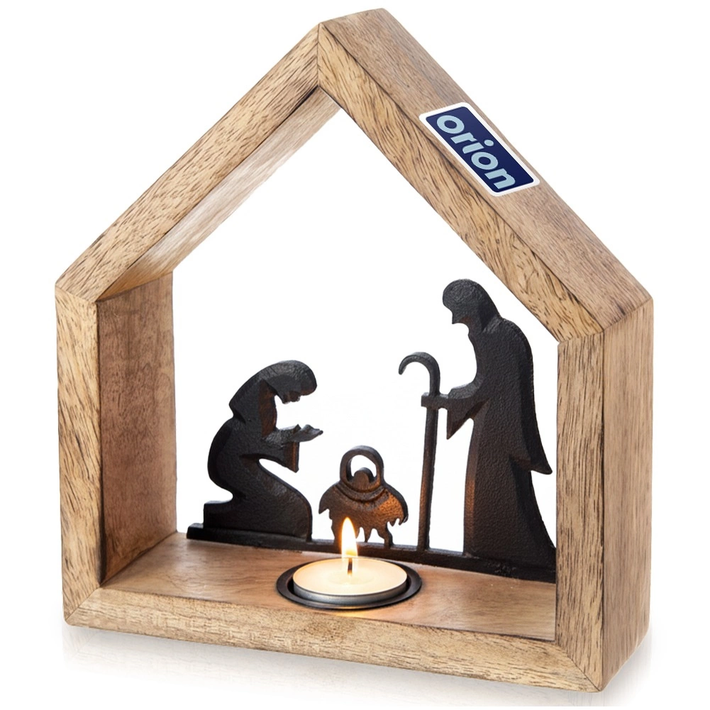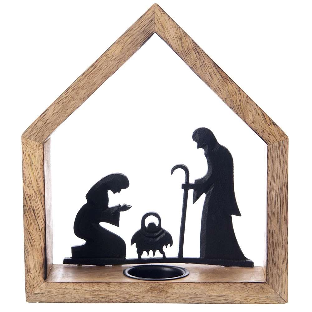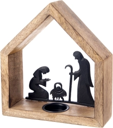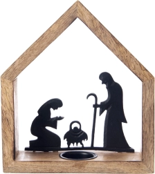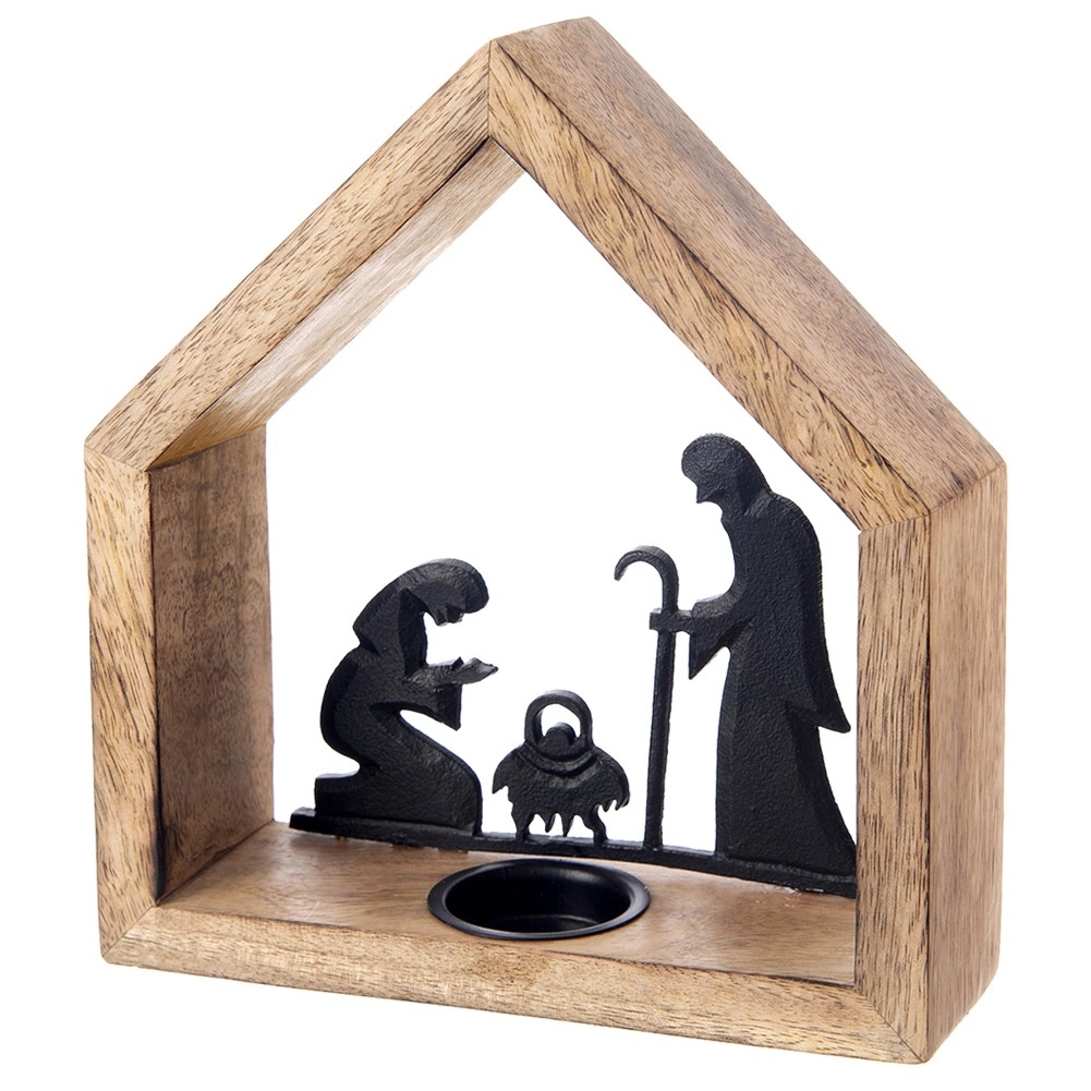 Stilski svečnik v obliki hišice z motivom betlehema iz naravnega mangovega lesa in črnega kovina prinese v interier toplo, praznično vzdušje. Ima frezano odprtino za čajno svečko (tealight) s premerom do 4 cm, stabilno osnovo in rustikalen dizajn, ki izstopa na mizi, komodi ali na okenski polici.