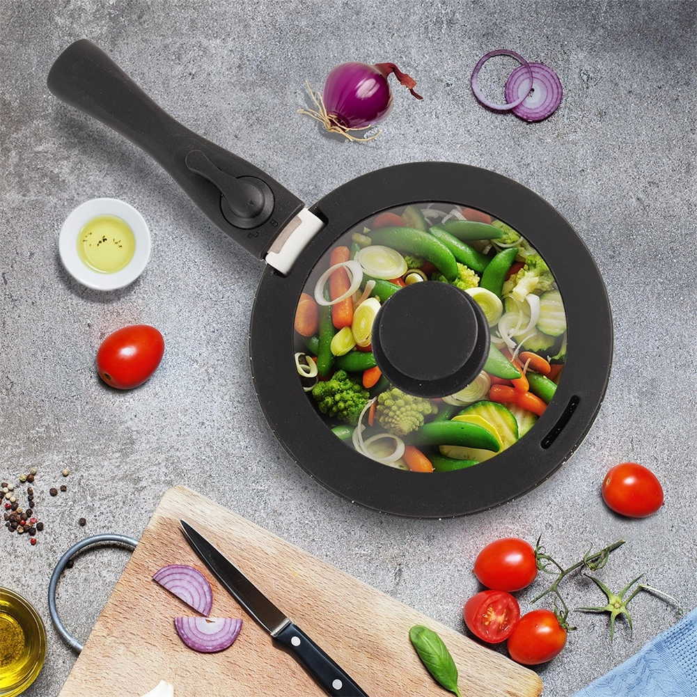 Zahvaljujoč vzdolžni odprtini za odvod pare imate kuhanje pod nadzorom, odprtino pa lahko uporabite tudi kot pomoč pri zlivanju tekočin. Poseben stranski izrez omogoča brezskrbno uporabo s posodami z odstranljivim ročajem, in sicer tako na štedilniku kot v pečici do 220 °C.