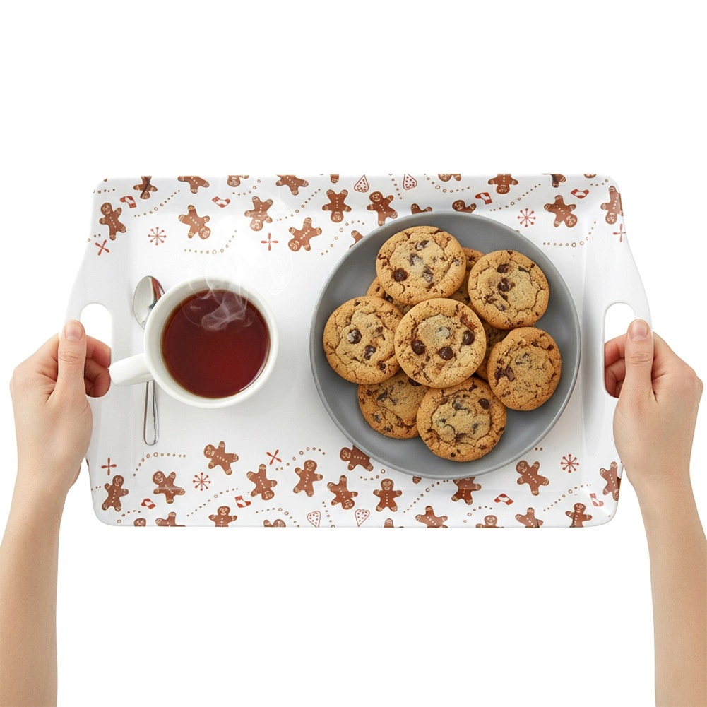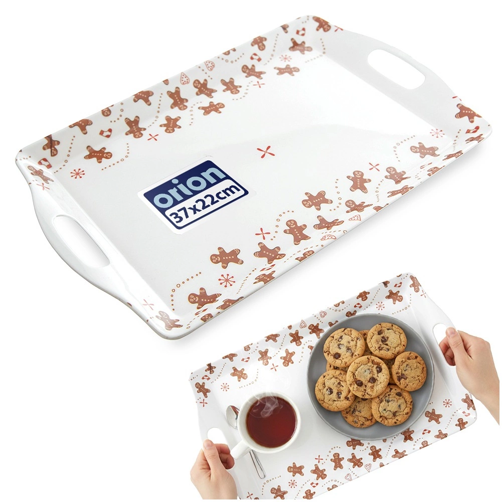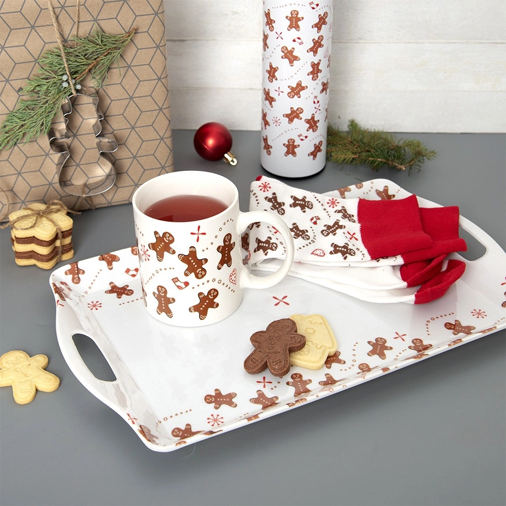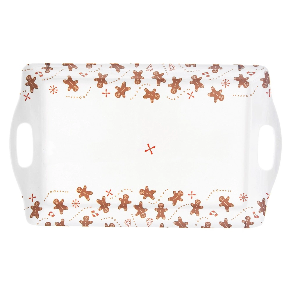 Praktičen in lahek pladenj z merami 37,5 × 23 × 2,5 cm olajša varno prenašanje kave, čaja, sladic in drobnih prigrizkov. Belo površino dopolnjuje dekor figuric iz medenjakov, ki vašemu serviranju doda praznično in igrivo vzdušje skozi vse leto.