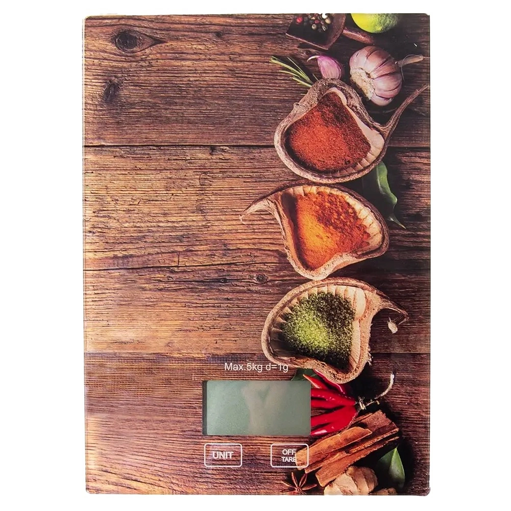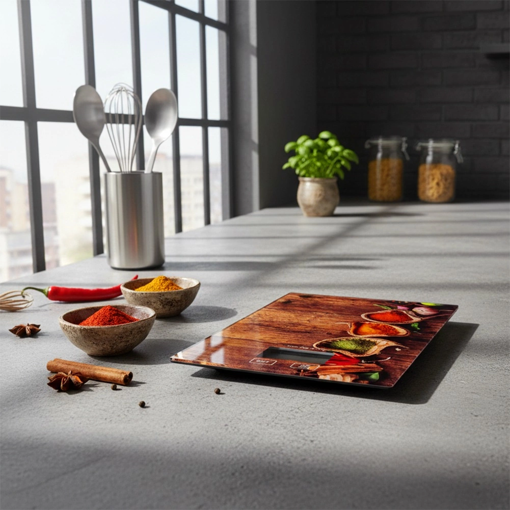 Kompaktna steklena kuhinjska tehtnica z nosilnostjo 5 kg in natančnim LCD-zaslonom za hitro in natančno tehtanje sestavin. Ponuja več merskih enot (g, oz, ml, lb/oz, fl oz), praktično funkcijo TARE, samodejni izklop za varčevanje z energijo ter nedrseče nogice za stabilnost. Stilski dekor z motivom začimb se odlično poda v vsako kuhinjo.