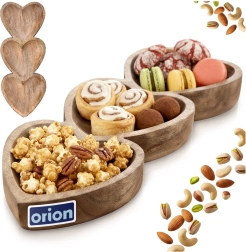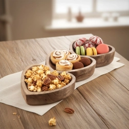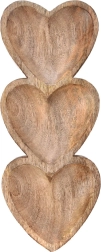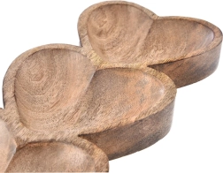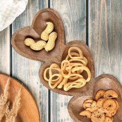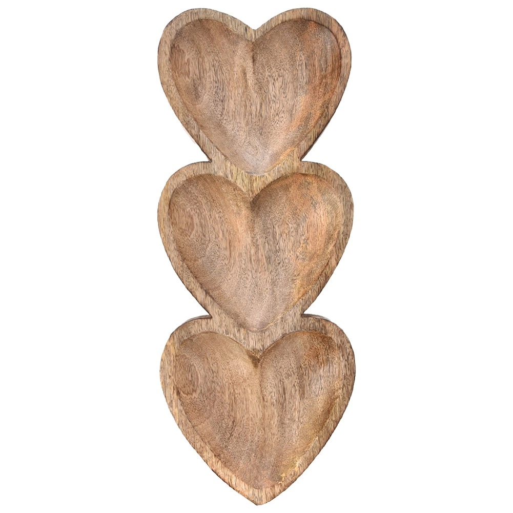 Elegantna podolgovata deska z merami 40 × 16 × 3,5 cm prinaša izviren dizajn s tremi srčastimi posodicami v enem kosu. Vsako srce meri približno 16 × 16 cm, kar omogoča pregledno ločevanje različnih dobrot – od tapasov in omak do pralin in suhega sadja.