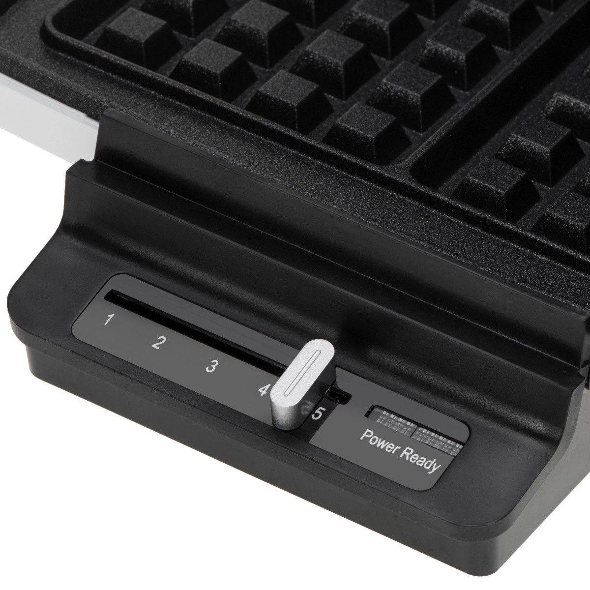 Drsni regulator s stopnjami 1–5 vam omogoča natančno izbiro stopnje zapečenosti – od nežnih do popolnoma hrustljavih vafljev. Indikatorja Power in Ready olajšata časovno usklajevanje.