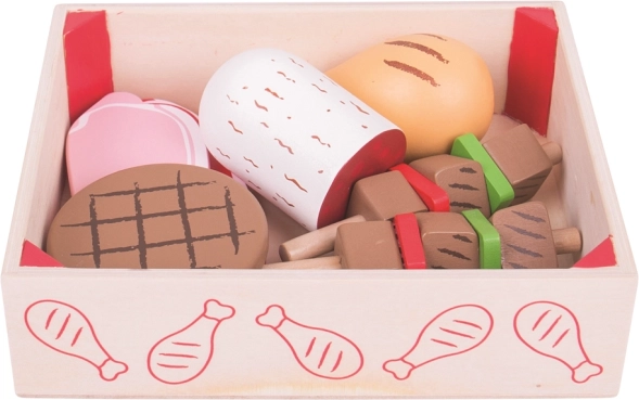 Ta kakovostna lesena zabojčka je polna “mesnih” specialitet, ki jih otroci poznajo iz kuhinje. V njej najdejo slanino, zrezek, klobaso, piščanca in druge kose, s katerimi zlahka pripravijo pojedino za vso družino. Po igri vse pospravijo nazaj v praktično škatlo – red je v hipu.