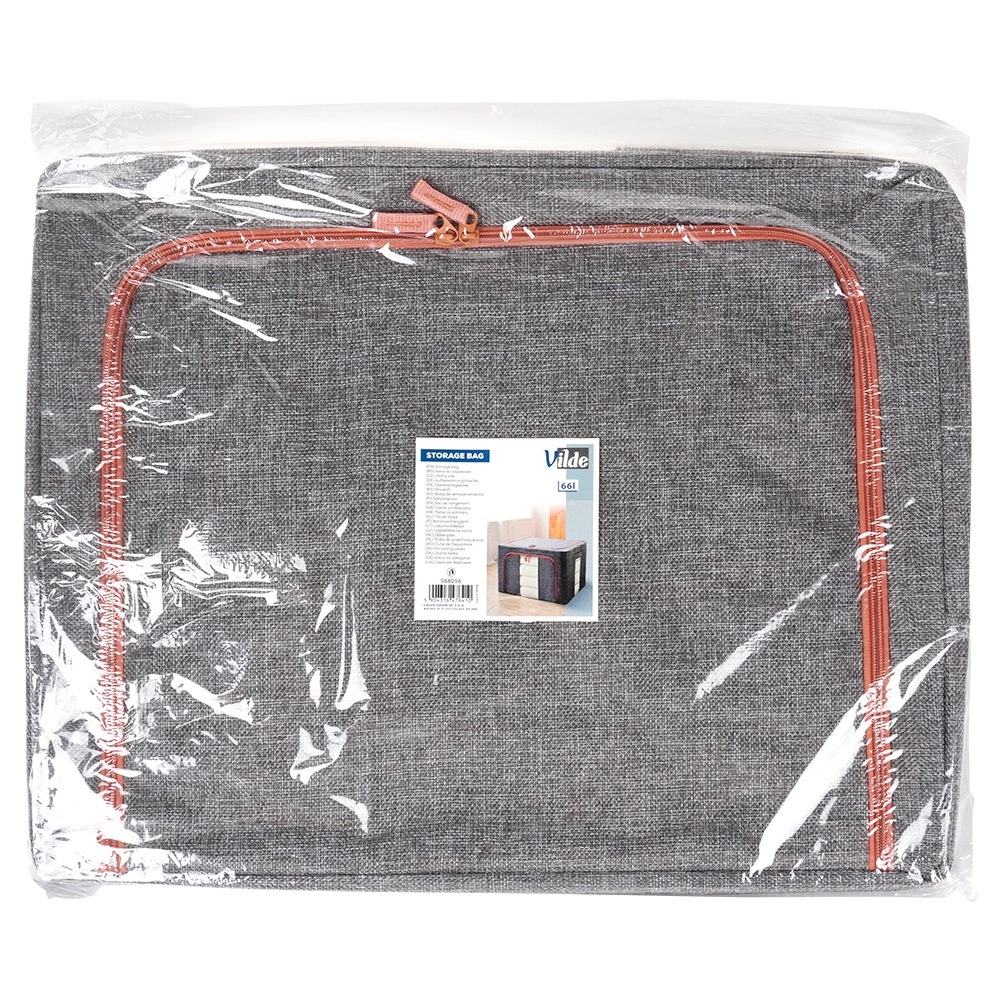 Ohranite dom organiziran s prostorno vrečo prostornine 66 l in merami 50 × 40 × 33 cm. Trpežna poliestrska tkanina v sivi melirani barvi s kontrastno zadrgo zanesljivo ščiti tekstil pred prahom, vlago in škodljivci. Zaradi trdne notranje konstrukcije drži obliko in jo je mogoče enostavno potisniti v omaro ali pod posteljo.
