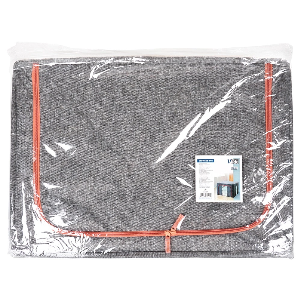 Maksimizirajte prostor v omari ali pod posteljo s prostorno shranjevalno vrečo s prostornino 100 litrov. Trpežno poliestrsko blago v sivi melirani barvi in kakovostne dvojne zadrge zagotovijo varno shranjevanje posteljnine, sezonskih oblačil ali tekstila. Prozorna okenca omogočajo hiter pregled vsebine brez odpiranja.