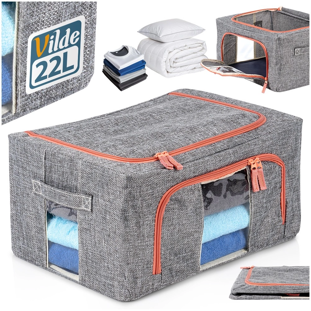 Ohranite red v omari in pod posteljo. Vzdržljiv tekstilni organizator iz poliestra v sivi melirani barvi s kontrastno zadrgo nudi čisto in varno shranjevanje posteljnine ter sezonskih oblačil. Prozorno okence omogoča takojšen pregled vsebine brez odpiranja, kovinski okvir pa drži obliko, da se škatla ne poseda.