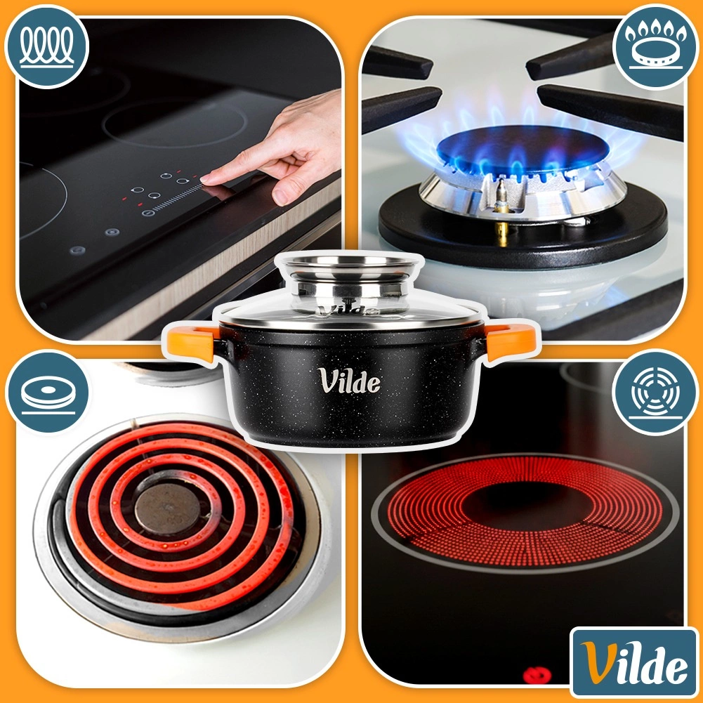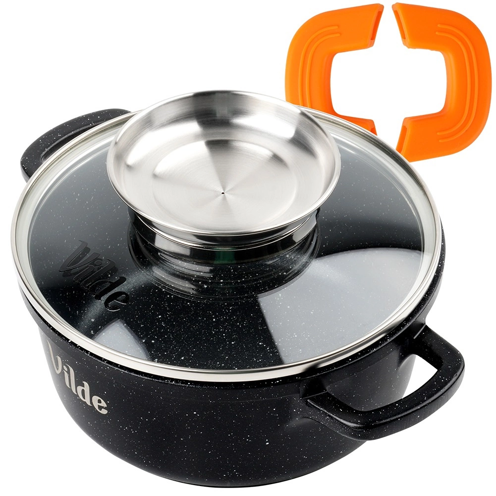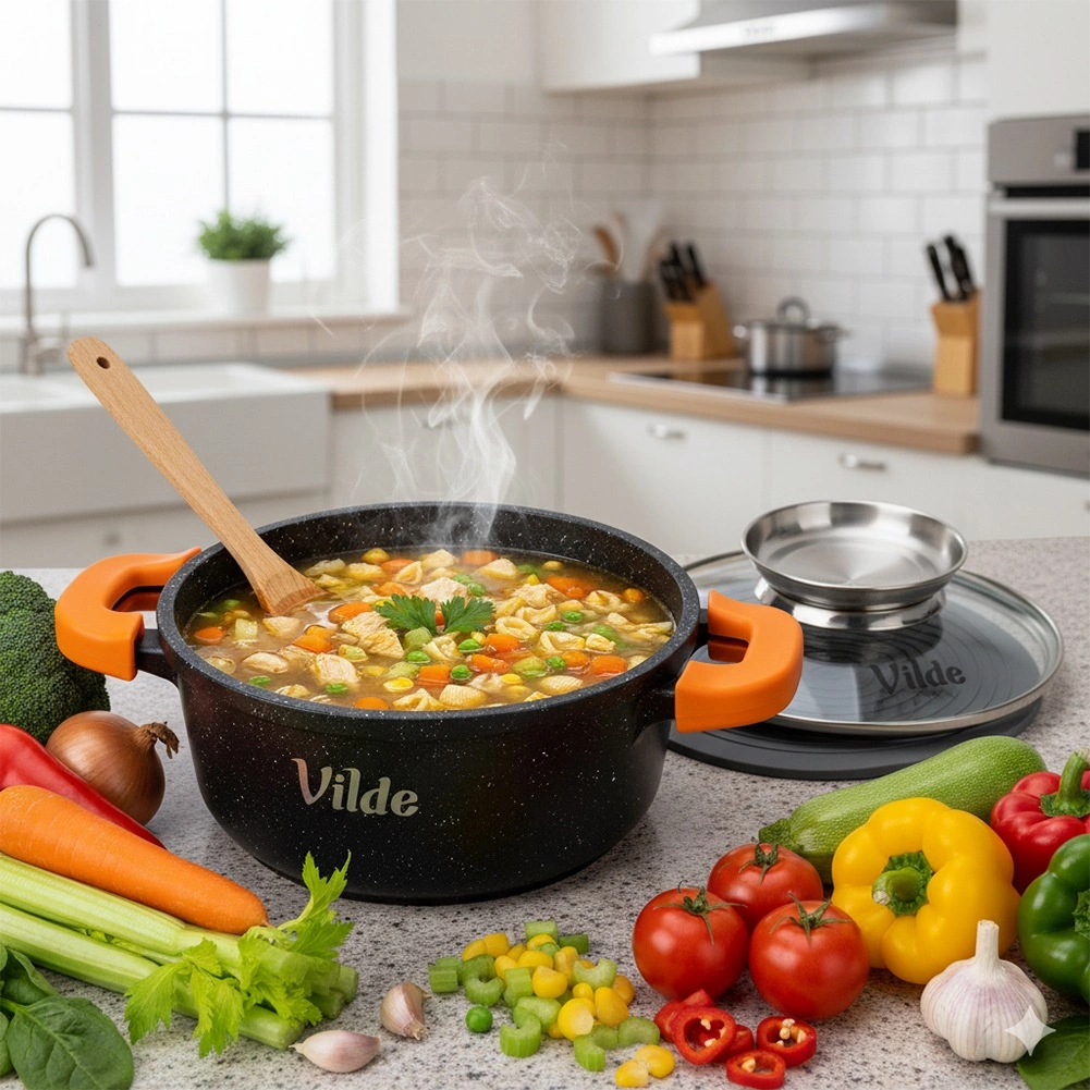Ergonomski silikonski ovitki na ročajih zagotavljajo zanesljiv in varen oprijem tudi pri visokih temperaturah. Debelo dno z indukcijsko ploščo enakomerno porazdeli toploto, kar skrajša čas priprave in poveča učinkovitost. Lonec je primeren za vse vrste štedilnikov in za pomivanje v pomivalnem stroju.